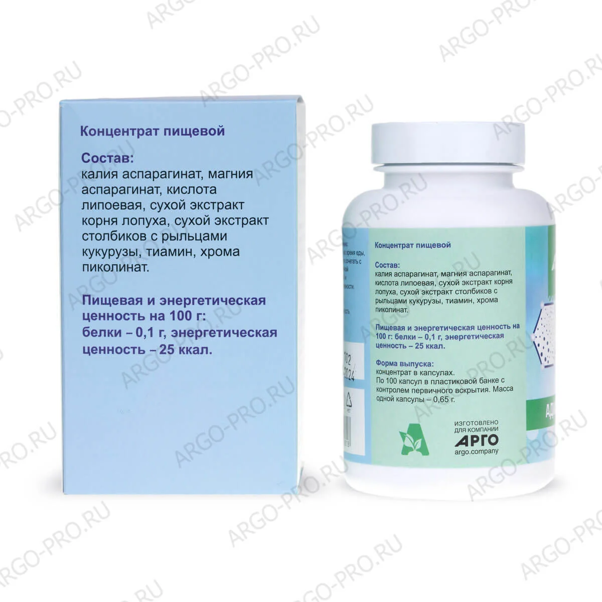 Состав: магния аспарагинат, калия аспарагинат, липоевая кислота, сухой экстракт корня лопуха, сухой экстракт столбиков c рыльцами кукурузы, витамин В1 (тиамин); хрома пиколинат, вспомогательные вещества – сахар молочный (лактоза) магния стеарат. В 1 капсуле содержится: липоевая кислота 10,0 мг; Витамин В1 0,5 мг; Хром 0,015 мг. Калий является основным внутриклеточным ионом, принимающим участие в регуляции водного, кислотного и электролитного баланса. Участвует в проведении импульсов по нервным волокнам, осуществлении мышечных сокращений, поддержании сердечного ритма, регуляции артериального давления. Магния оксид участвует в более чем 300 ферментных реакций, в частности, обеспечивающих образование и расходование энергии в клетках, участвующих в синтезе белков и нуклеиновых кислот, способствует транспорту важнейших ионов в клетку (кальция, калия, фосфора). Принимает участие в регуляции проницаемости мембран, нервно-мышечной возбудимости, ограничивает стрессовые реакции. Способствует усвоению витаминов группы В, витаминов С и Е. Необходим для нормального функционирования сердечной мышцы, недостаток магния приводит к повышению риска развития гипертонии и заболеваний сердца. Обладает антиспастическим, сосудорасширяющим и мочегонным эффектами. Хром участвует в работе инсулинового рецептора, повышая эффект инсулина в 7 раз. Экстракт корня лопуха обладает мочегонным, желчегонным действием, стимулирует секрецию поджелудочной железы, улучшает минеральный обмен. Экстракт столбиков c рыльцами кукурузы содержит биологически активные соединения, влияющие на работу большого количества генов, участвующих в регуляции углеводного, жирового, холестеринового обмена, что проявляется в снижении уровня глюкозы, инсулина, холестерина и нейтральных жиров в крови. Также кукурузные рыльца способствуют снижению артериального давления, обладают капилляроукрепляющим, противоотечным, антитромбогенным, противовоспалительным, спазмолитическим, желчегонным, мочегонным действием.