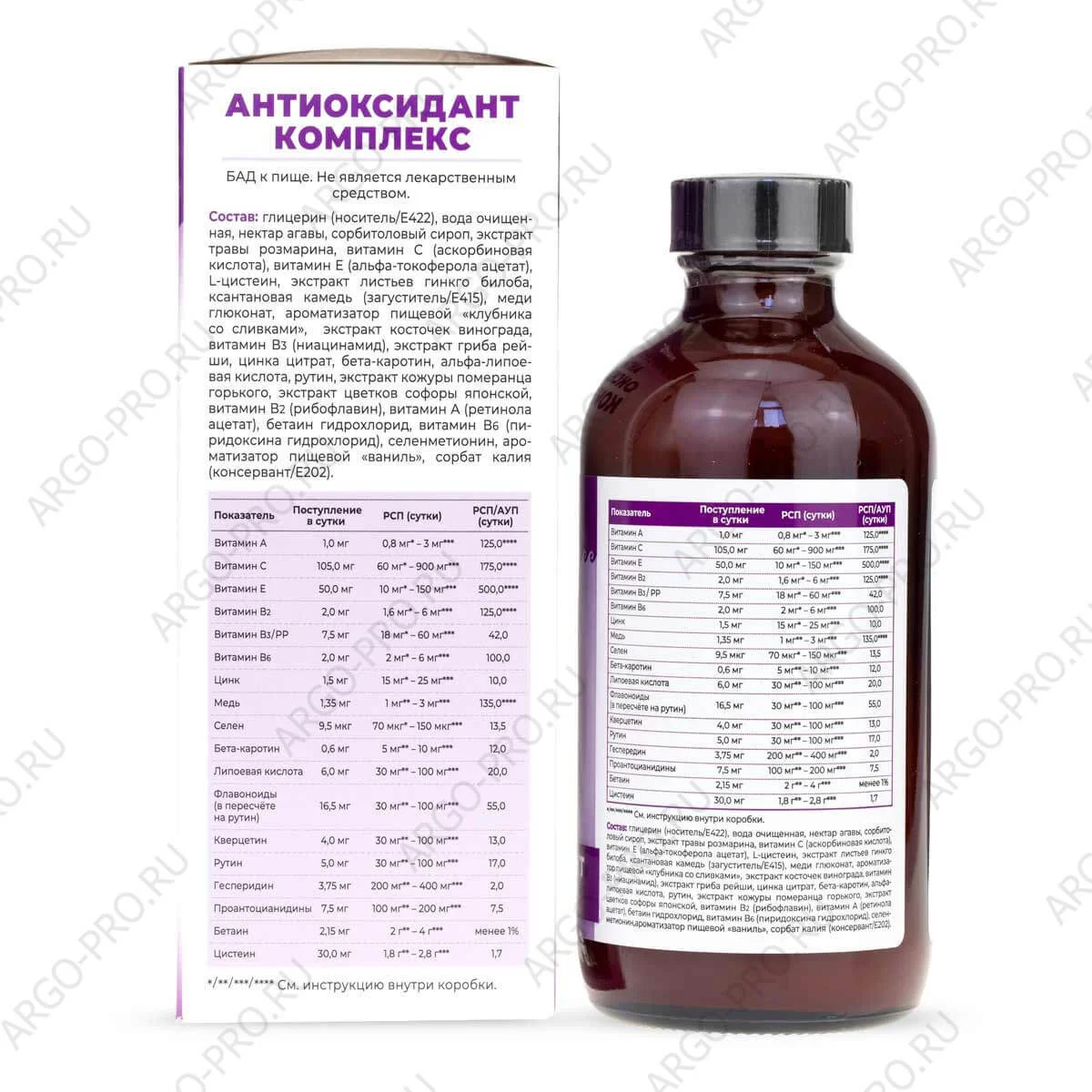 Состав: Глицерин (носитель/Е422), вода очищенная, нектар агавы, сорбитоловый сироп, экстракт травы розмарина, витамин С (аскорбиновая кислота), витамин Е (альфа-токоферола ацетат), L-цистеин, экстракт листьев гинкго билоба, ксантановая камедь (загуститель/Е415), меди глюконат, ароматизатор пищевой «клубника со сливками», экстракт косточек винограда, витамин В3 (ниацинамид), экстракт гриба рейши, цинка цитрат, бета-каротин, альфа-липоевая кислота, рутин, экстракт кожуры померанца горького, экстракт цветков софоры японской, витамин В2 (рибофлавин), витамин А (ретинола ацетат), бетаин гидрохлорид, витамин В6 (пиридоксина гидрохлорид, селенметионин, ароматизатор пищевой «ваниль», сорбат калия (консервант/Е202).