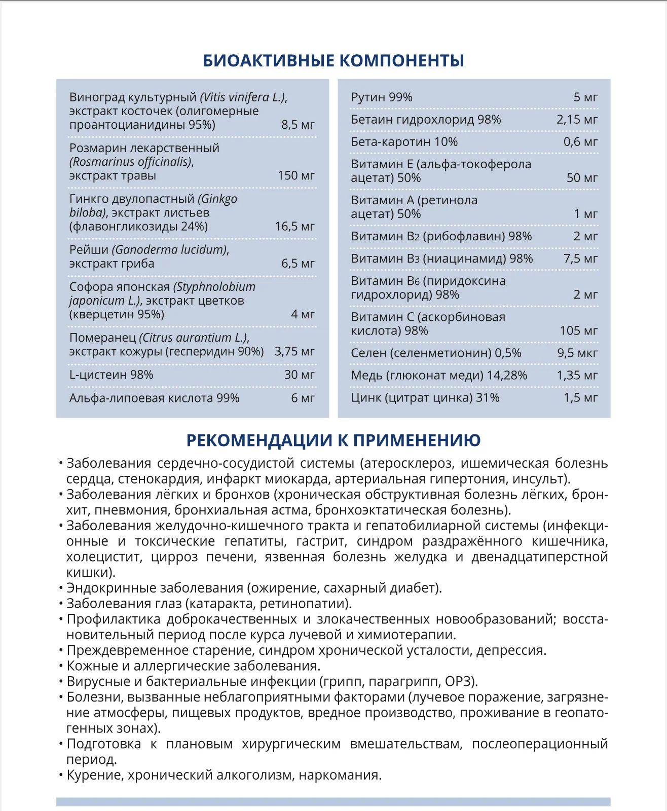 Показания к применению: В качестве биологически активной добавки - источника витаминов, цинка и флавоноидов. Рекомендуется для обогащения рациона биологически активными веществами для профилактики и в качестве компонента комплексной терапии следующих состояний и заболеваний: