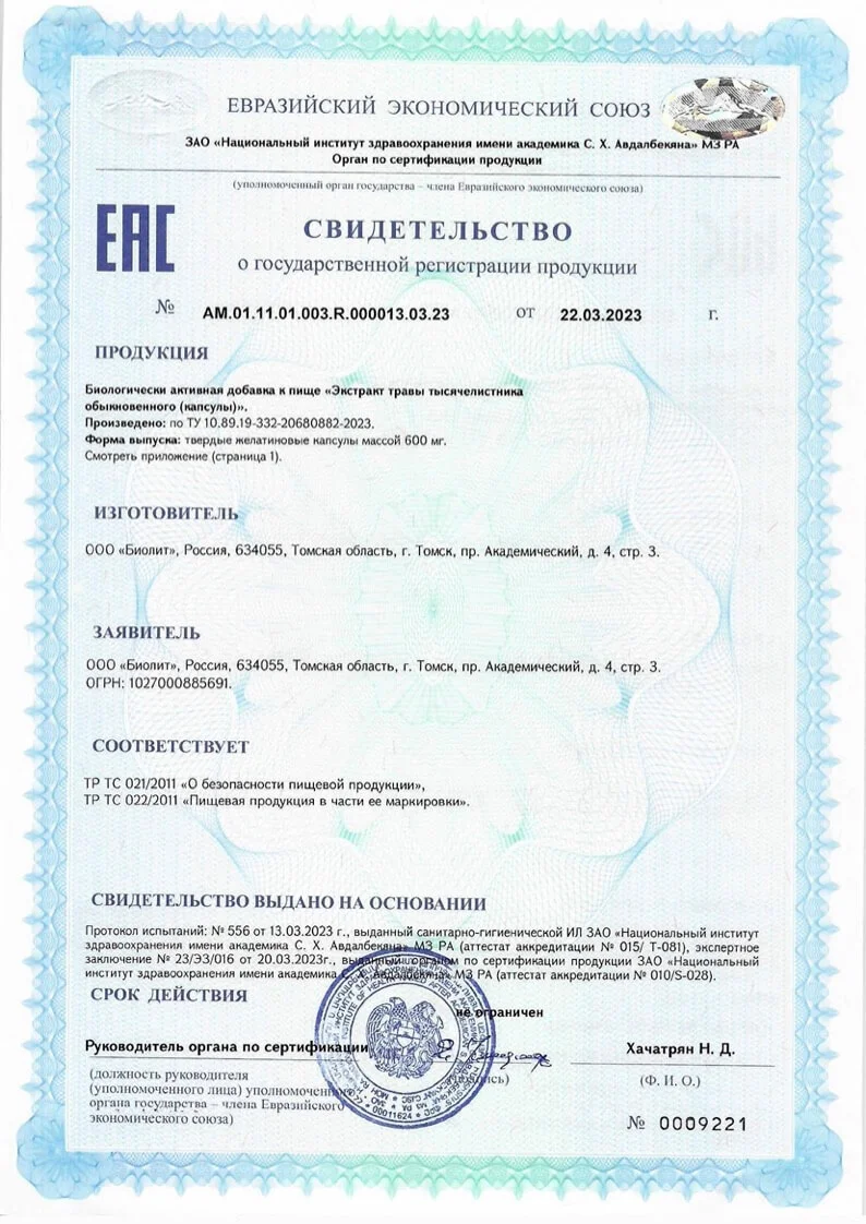 Состав: Экстракт травы тысячелистника обыкновенного (Achillea millefolium L.) концентрированный сухой.