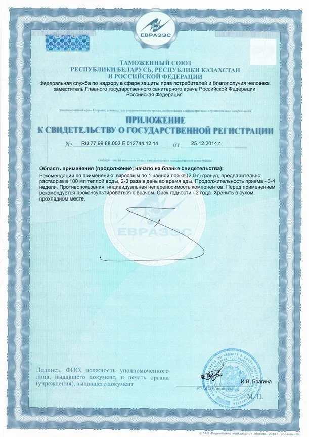 Способ применения: Принимать по 2 г (1 ч.л.) 3 раза в день, за 15-30 мин до еды, предварительно растворив гранулы в 100 мл теплой воды. Курс – 3-4 недели.