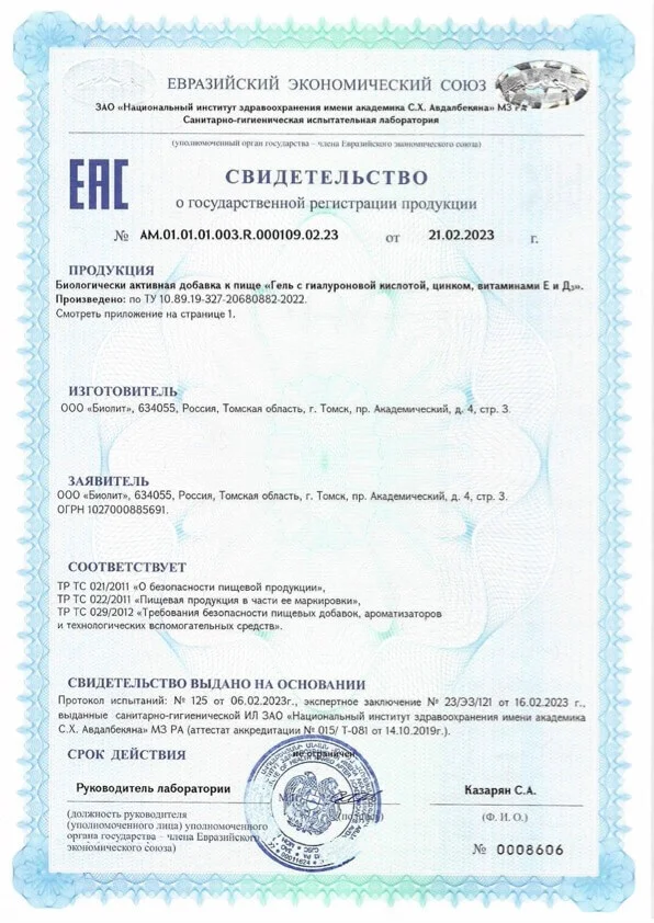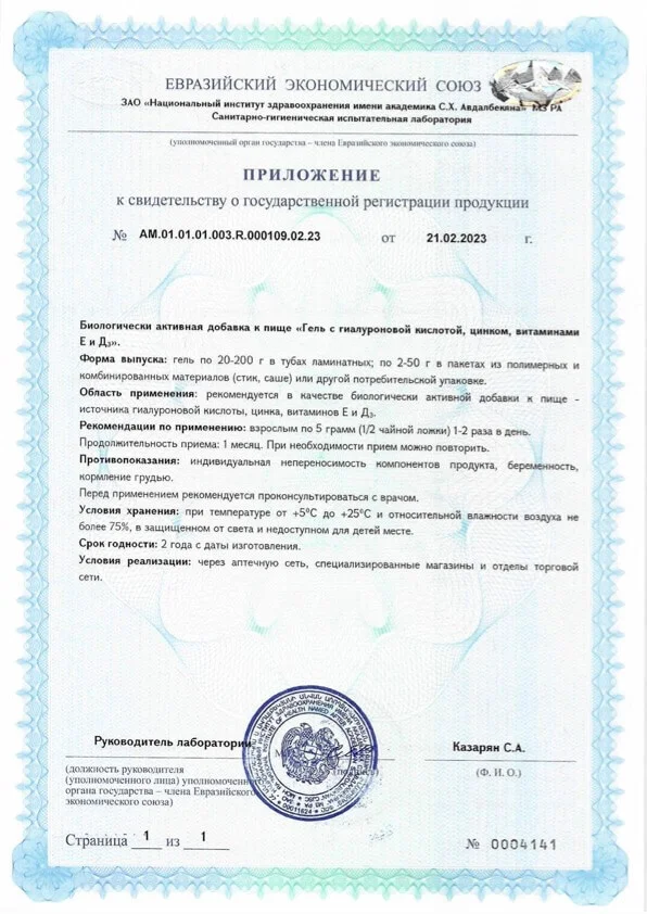 Гель представляет собой инновационный комплекс, содержащий 100% от суточной потребности гиалуроновой кислоты, цинка, витаминов Е и Д3.