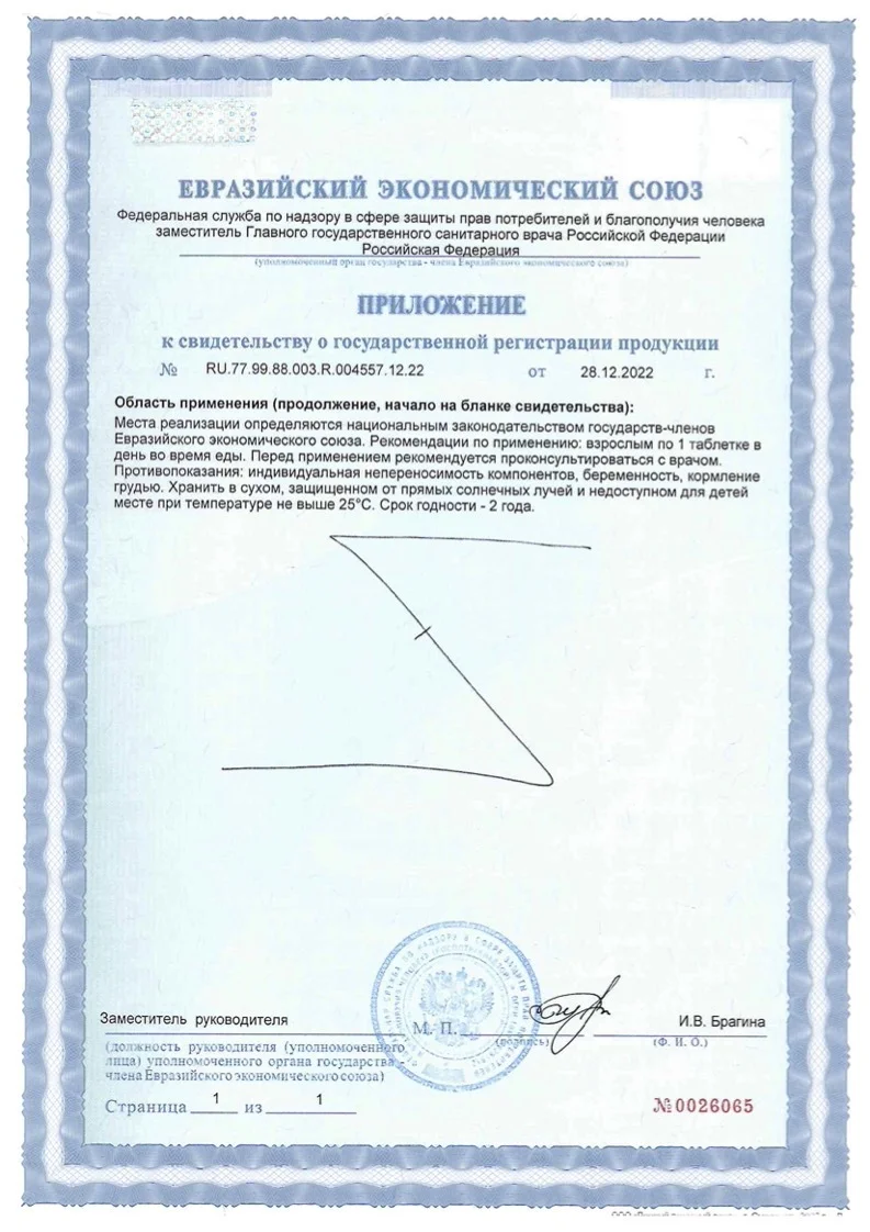 Способ применения: Взрослым принимать по 1 таблетке в день во время еды. Перед применением рекомендуется проконсультироваться с врачом.