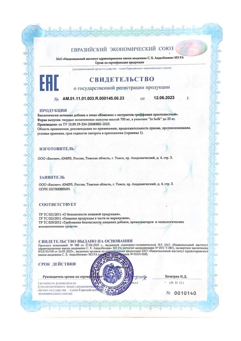БАД Гриффония комплекс, Биолит (Арго), 60 капс