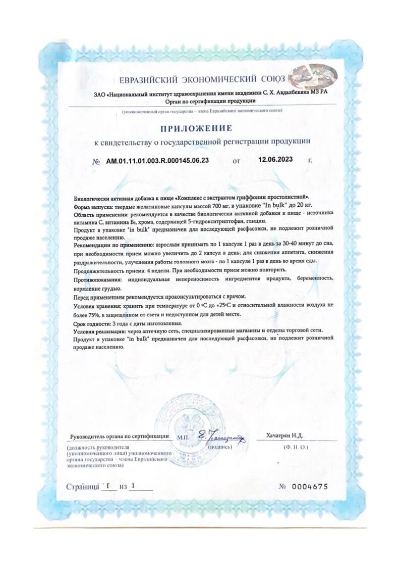 Применение комплекса с экстрактом гриффонии способствует уменьшению тревожности, раздражительности, агрессивности, апатии, депрессивных состояний; повышению фона настроения, стрессоустойчивости и работоспособности; нормализации циркадных ритмов сна и бодрствования, улучшению качества сна (быстрое и легкое засыпание, здоровый и спокойный сон), позволяет контролировать вес при расстройствах пищевого поведения.