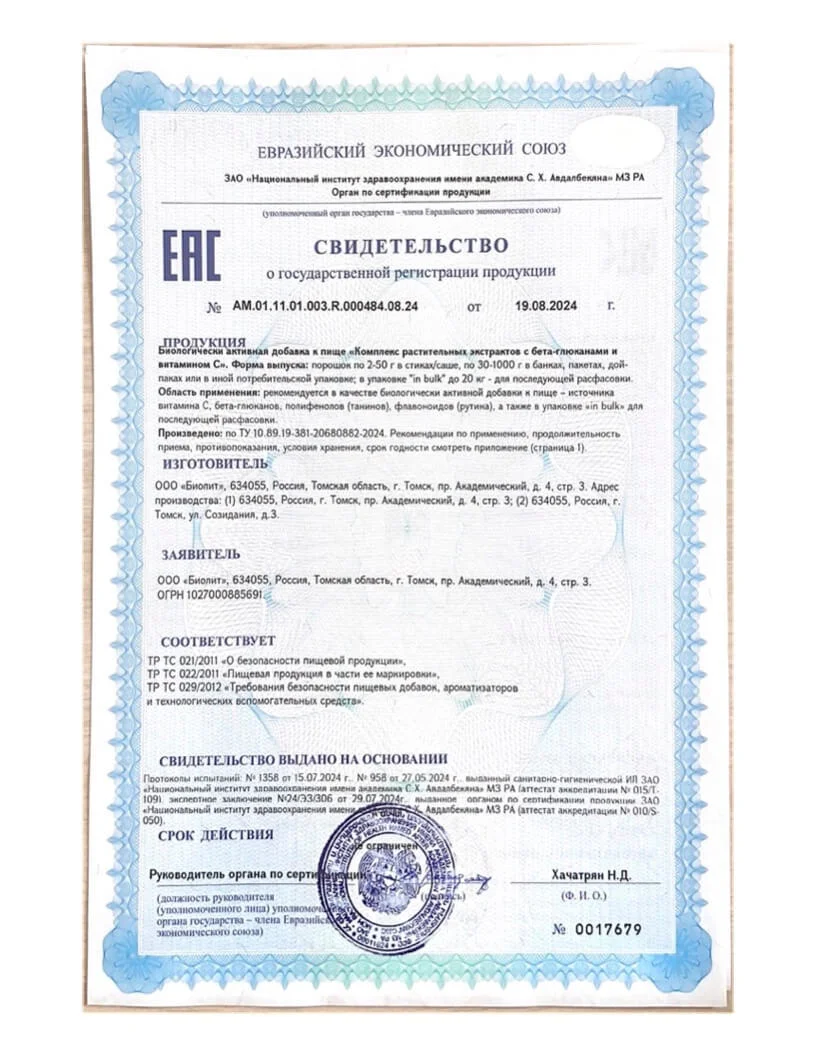 экстракт солянки холмовой - 400 мг, экстракт листьев малины обыкновенной - 300 мг, экстракт коры ивы белой - 200 мг, экстракт корней лопуха большого - 200 мг, экстракт плодов шиповника коричного - 200 мг, концентрированный сок плодов клюквы обыкновенной - 200 мг, экстракт корней алтея лекарственного - 100 мг, экстракт листьев подорожника большого - 100 мг, экстракт цветков ромашки аптечной - 100 мг, экстракт перегородок грецкого ореха - 100 мг, экстракт корней имбиря обыкновенного - 100 мг, бета-глюканы грибов - 64 мг, витамин С - 1000 мг, полифенолы - 100 мг, флавоноиды - 5 мг.