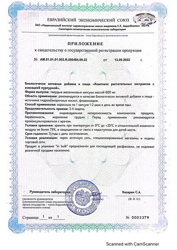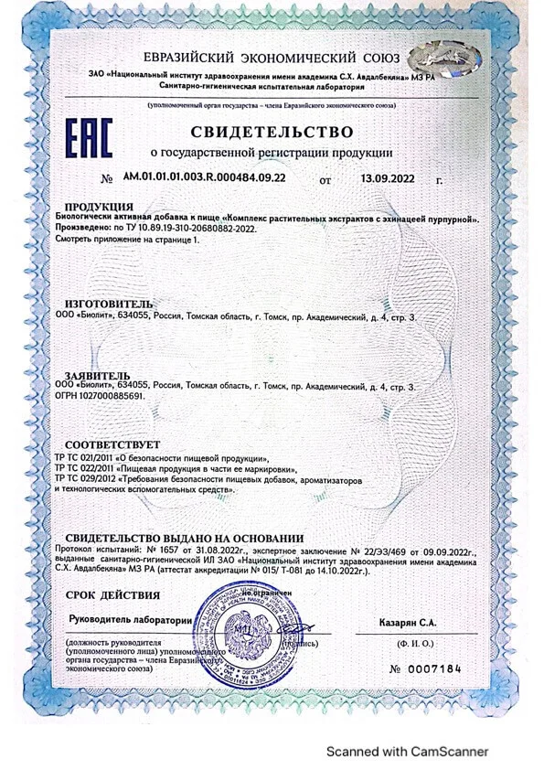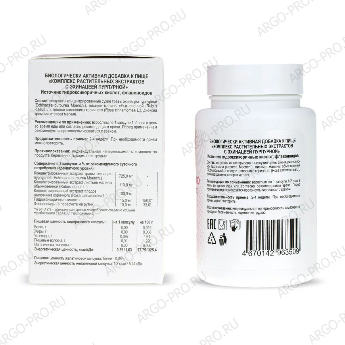 Состав: экстракты концентрированные сухие травы эхинацеи пурпурной (Echinacea purpurea Moench.), листьев малины обыкновенной (Rubus idaeus L.), плодов шиповника коричного (Rosa cinnamomea L.), диоксид кремния, стеарат магния.