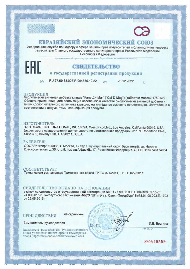 Каль-Ди-Маг - одна из самых популярных добавок на рынке. Эффективность его работы можно видеть во многих областях здоровья: костно-мышечная система, сердечно-сосудистая и т.д. При создании нашего продукта "Каль-Ди-Маг" применены хелатные формы кальция и магния, а это означает их усвоение лучше, чем у аналогов на рынке. Если микроэлемент не усваивается организмом, то он не может попасть в кости и выполнить функцию, на которую направлен приём. Поэтому, усваиваемость – основной показатель «работы» продукта. Но не всякий кальций усваивается одинаково. Например, неорганический кальций (обычно применяемый в витаминных формулах) усваивается на 17%, а хелаты кальция - на 44%. Таким образом, хелаты кальция усваиваются в 3 раза лучше. Неорганический магний, при попадании в организм, усваивается в среднем на 16%, а хелат магния - на 87%. Следовательно, хелаты магния усваиваются в 5,6 раза лучше, чем неорганическая форма этого микроэлемента. На практике это означает, во-первых, что Вы экономите деньги. А во-вторых, организм действительно получит и усвоит то, что ему необходимо. В формуле Каль-Ди-Мага использовано наиболее эффективное соотношение - 2: 1 (две части кальция и одна часть магния). Именно в такой пропорции кальций и магний наиболее эффективно усваиваются организмом. Для того, чтобы кальций и магний эффективно усваивались, в формулу добавлены витамины D и С (первый стимулирует в кишечнике всасывание кальция и магния, участвует в транспорте кальция, второй необходим для процесса формирования костей). Для более качественного формирования костей и зубов в формулу добавлены клеточные соли (кальция фосфат, кальция сульфат, магния фосфат, кремния оксид).
