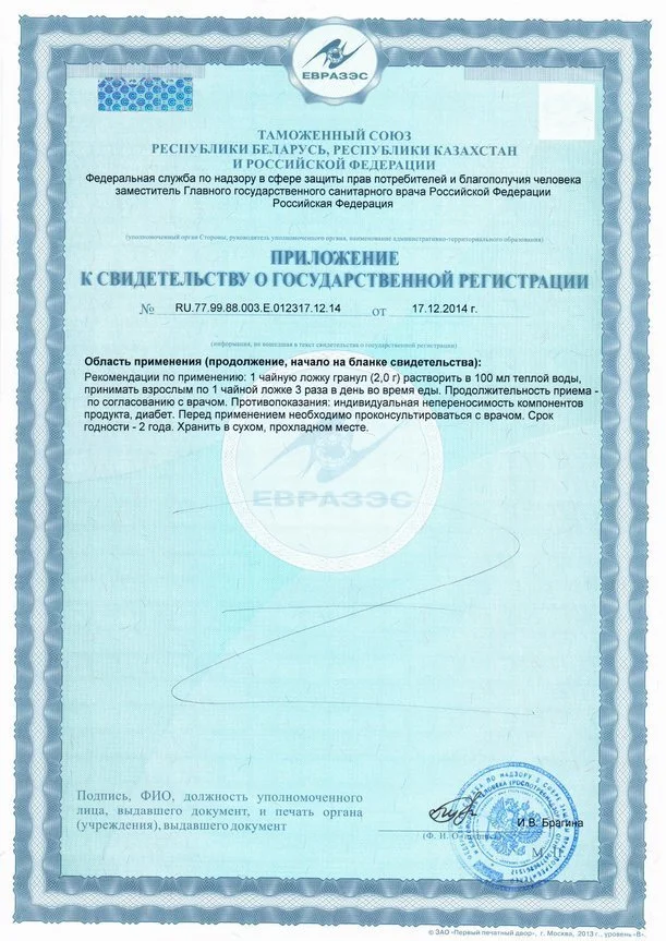 Способ применения: 2 г (1 ч. л.) гранул, растворенных в 100 мл теплой воды, принимать 3 раза в день во время еды. Длительность приема – по согласованию с врачом, возможен курс длительностью до 6 месяцев.