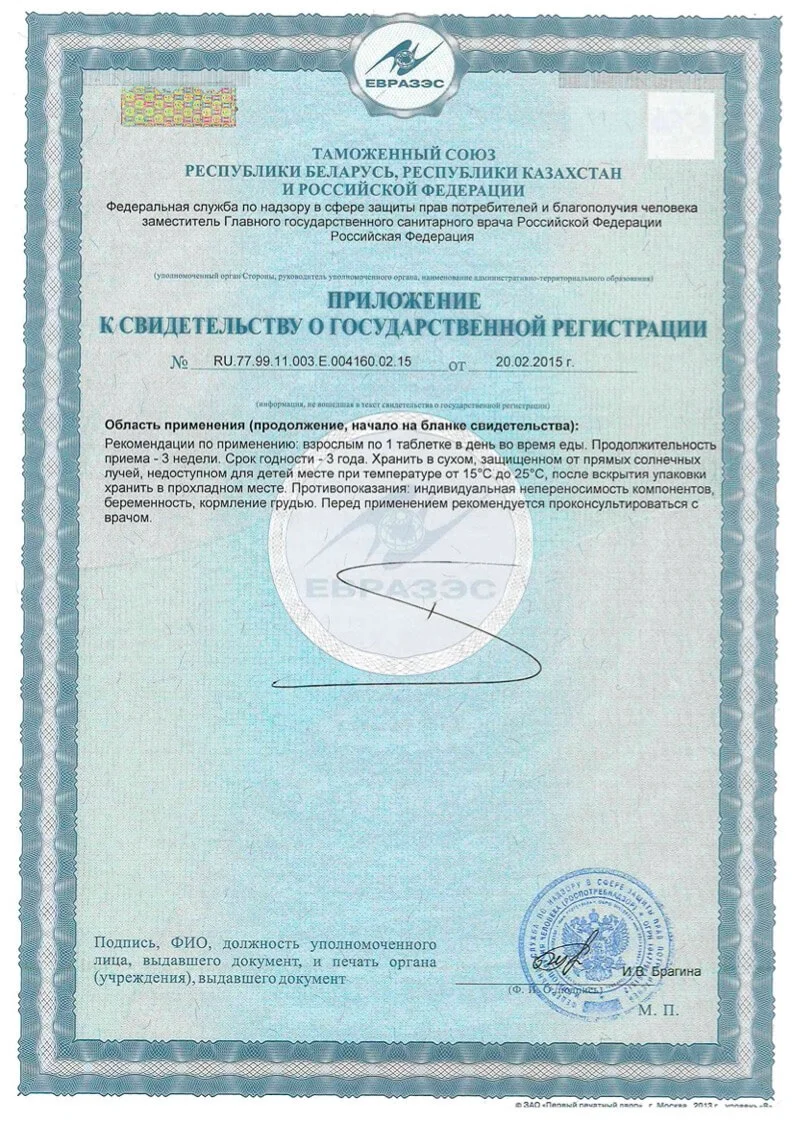Способ применения: взрослым по 1 таблетке в день во время еды. Продолжительность приёма – 3 недели.