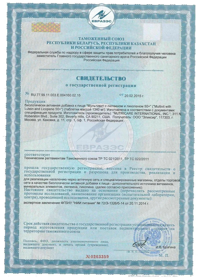 Состав: Карбонат кальция, хлорид калия, дикальций фосфат, оксид магния, DL-альфа-токоферил ацетат, аскорбиновая кислота, никотинамид, оксид цинка, D-кальция пантотенат, сульфат марганца, холекальциферол, аминокислотный халат ванадия, фолиевая кислота, хлорид хрома, пиридоксина хлорид, ретинола ацетат, B-каротин, витамин K, D-биотин, ликопин, селена натрия, экстракт цветков календулы (содержит 40% лютеина), рибофлавин, тиамин мононитрит, оксид меди, йодид калия, цианокобаламин. Вспомогательные компоненты: микрокристаллическая целлюлоза (E460i), кроскарамеллоза (E468), стеариновая кислота (E570), кремния диоксид (E551), магния стерта (E470).