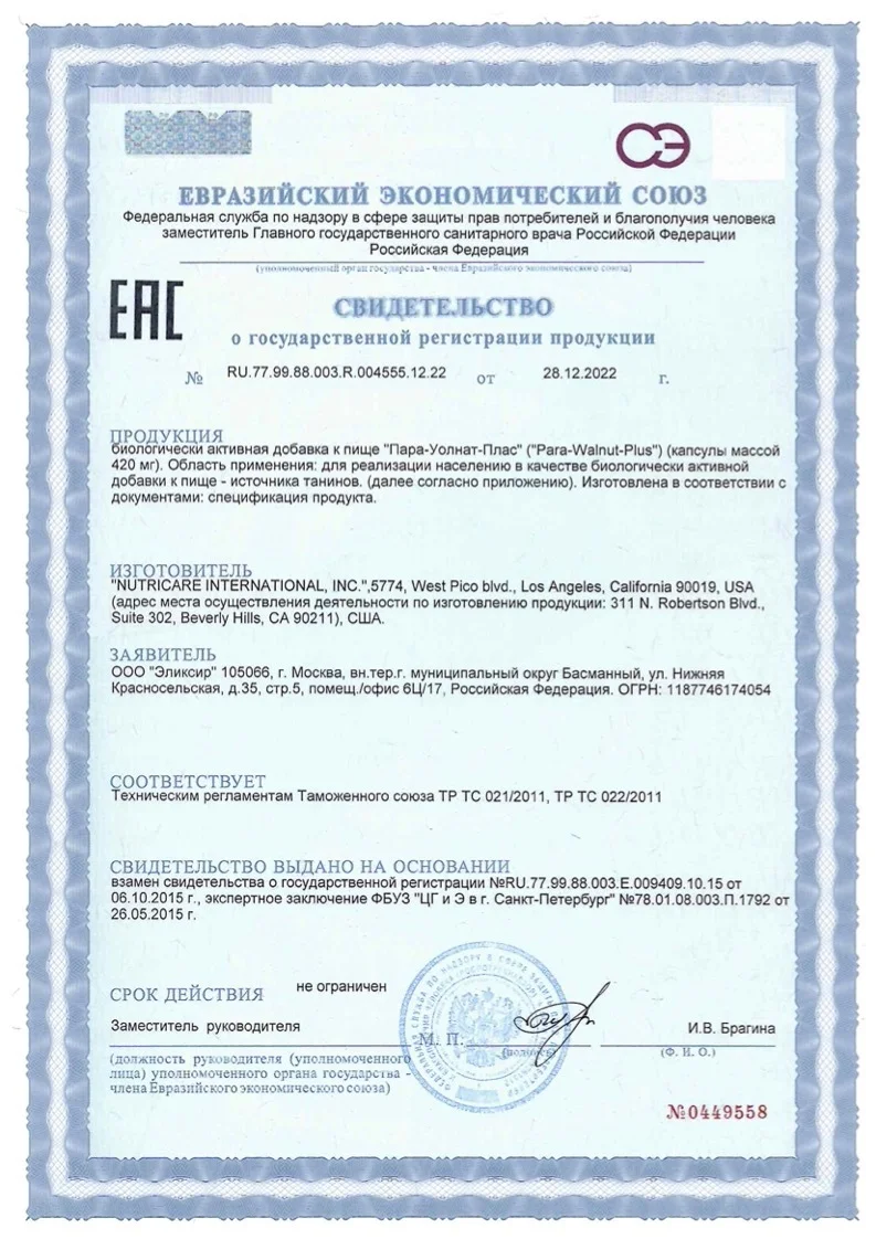 Состав: В 1 капсуле: скорлупа грецкого ореха (орех черный) – 150 мг, чеснок (Allium посевной) – 90 мг, экстракт черного грецкого ореха (скорлупа) – 60 мг, кора дуба порошок (дуб белый) – 20 мг, экстракт семян тыквы (тыква обыкновенная) – 16 мг. Вспомогательные компоненты: микрокристаллическая целлюлоза, стеарат магния. Энергетическая и пищевая ценность: 0,38 ккал / 1,59 кДж; белки – 0,09 г; жиры – 0,00 г; углеводы – 0,04 г. .