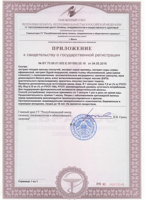 Состав: Экстракт плодов пальмы ползучей, крапива двудомная (экстракт корня), экстракт коры сливы африканской, бурая водоросль (экстракт), тыква обыкновенная (семена), L-селенометионин, цинка глюконат. Вспомогательные компоненты: рисовая мука, магния стеарат, ликопин, желатин.
