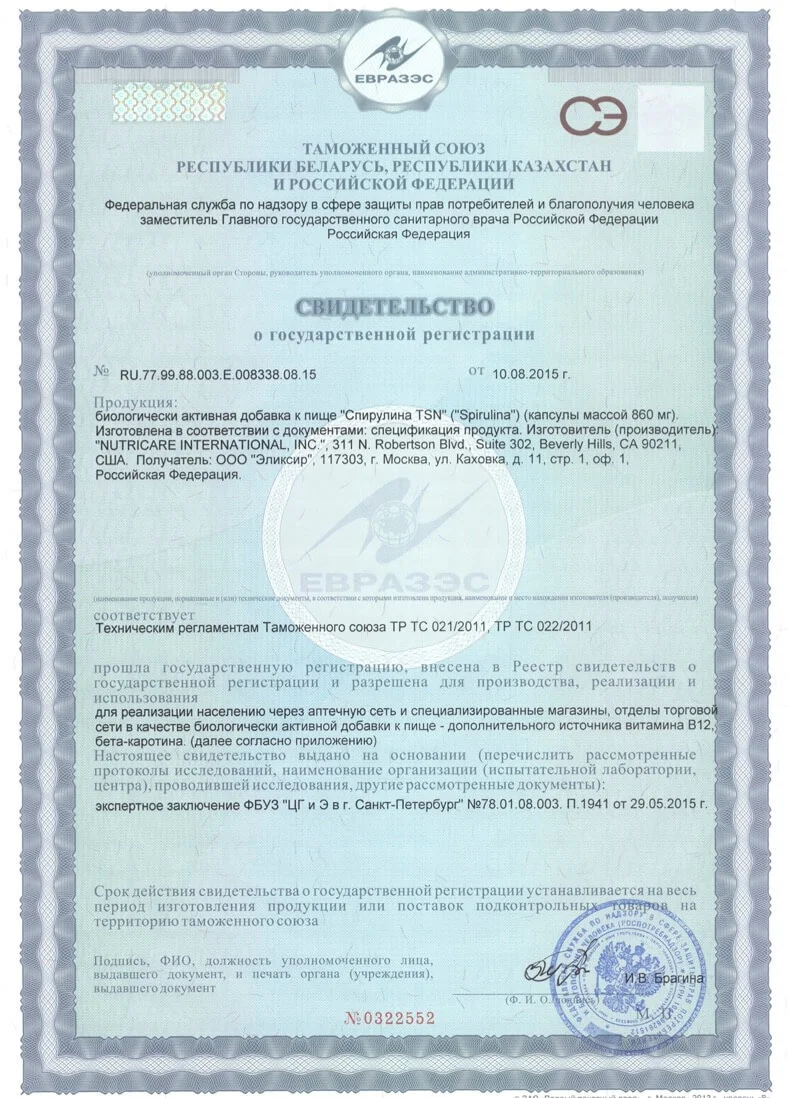 Состав: Порошок спирулины – 750 мг; вспомогательные компоненты: желатин, вода, титана диоксид. Содержание активных веществ в капсуле от АУП: бета-каротин - 2,1 мг / 20%; витамин В12 - 0,6 мкг / 60%