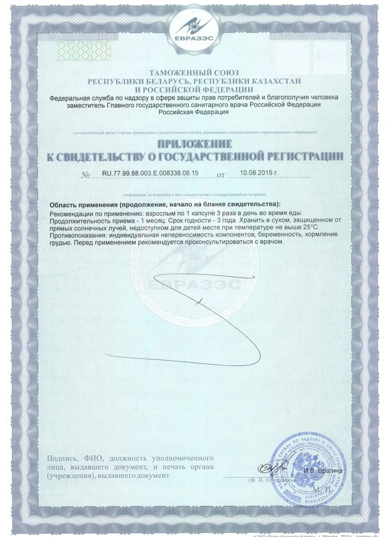 Способ применения: Взрослым по 1 капсуле 3 раза в день во время приема пищи. Продолжительность приема – 1 месяц.