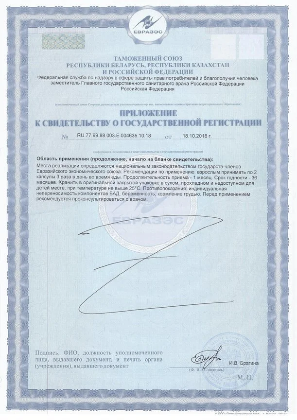 Способ применения: взрослым – по 2 капсулы 3 раза в день во время еды. Продолжительность приёма – 1 месяц.