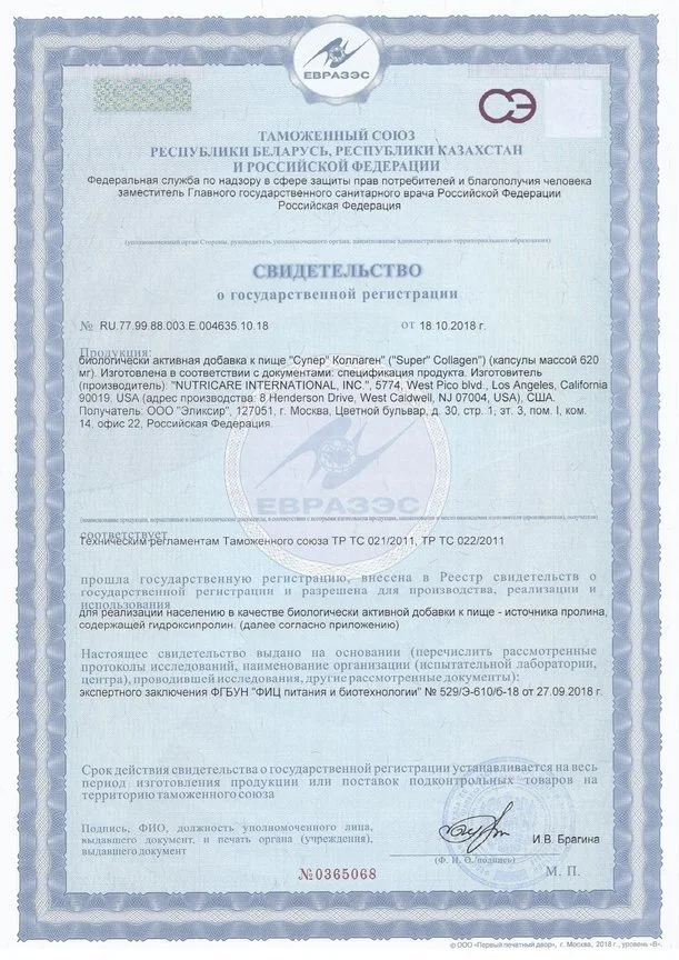 Состав: В 1 капсуле: гидролизат рыбьего коллагена – 500 мг, пролин – 120 мг, гидроксипролин – 10 мг. Вспомогательные компоненты: оболочка капсулы: желатин; добавки, препятствующие слеживанию и комкованию: стеарат магния (E470b), диоксид кремния аморфный (E551), диоксид титана (краситель E171).