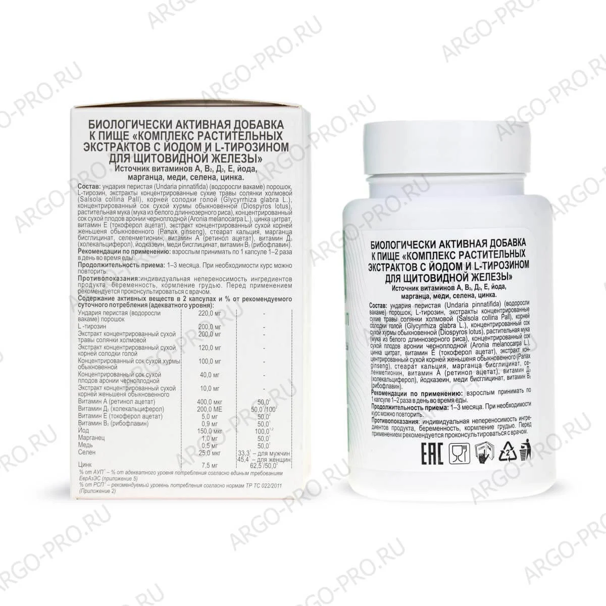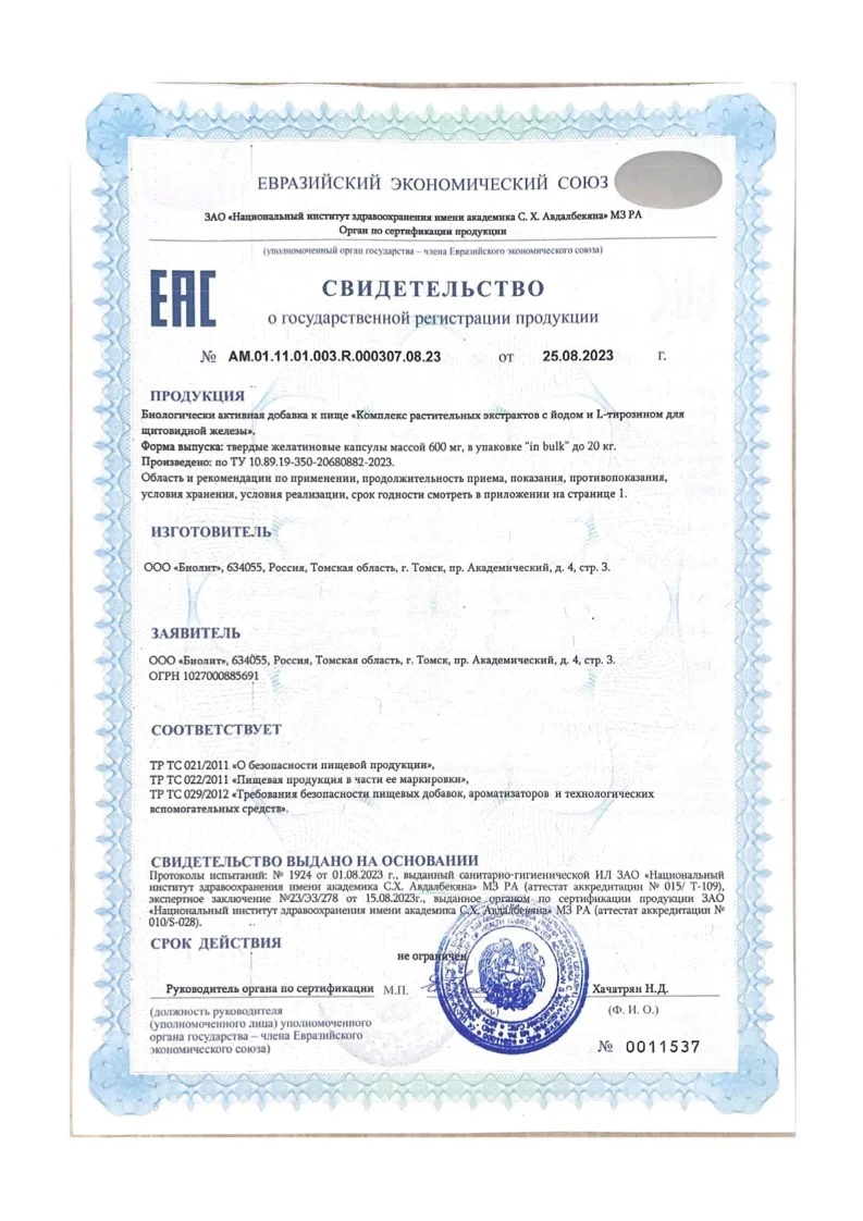 Состав: ундария перистая (Undaria pinnatifida) (водоросли вакаме) порошок, L-тирозин, экстракты концентрированные сухие травы солянки холмовой (Salsola collina Pall), корней солодки голой (Glycyrrhiza glabra L.), концентрированный сок сухой хурмы обыкновенной (Diospyros lotus), растительная мука (мука из белого длиннозерного риса), концентрированный сок сухой плодов аронии черноплодной (Aronia melanocarpa L.), цинка цитрат, витамин Е (токоферол ацетат), экстракт концентрированный сухой корней женьшеня обыкновенного (Panax ginseng), стеарат кальция, марганца бисглицинат, селенметионин, витамин А (ретинол ацетат), витамин Д3 (холекальциферол), йодказеин, меди бисглицинат, витамин В2 (рибофлавин).