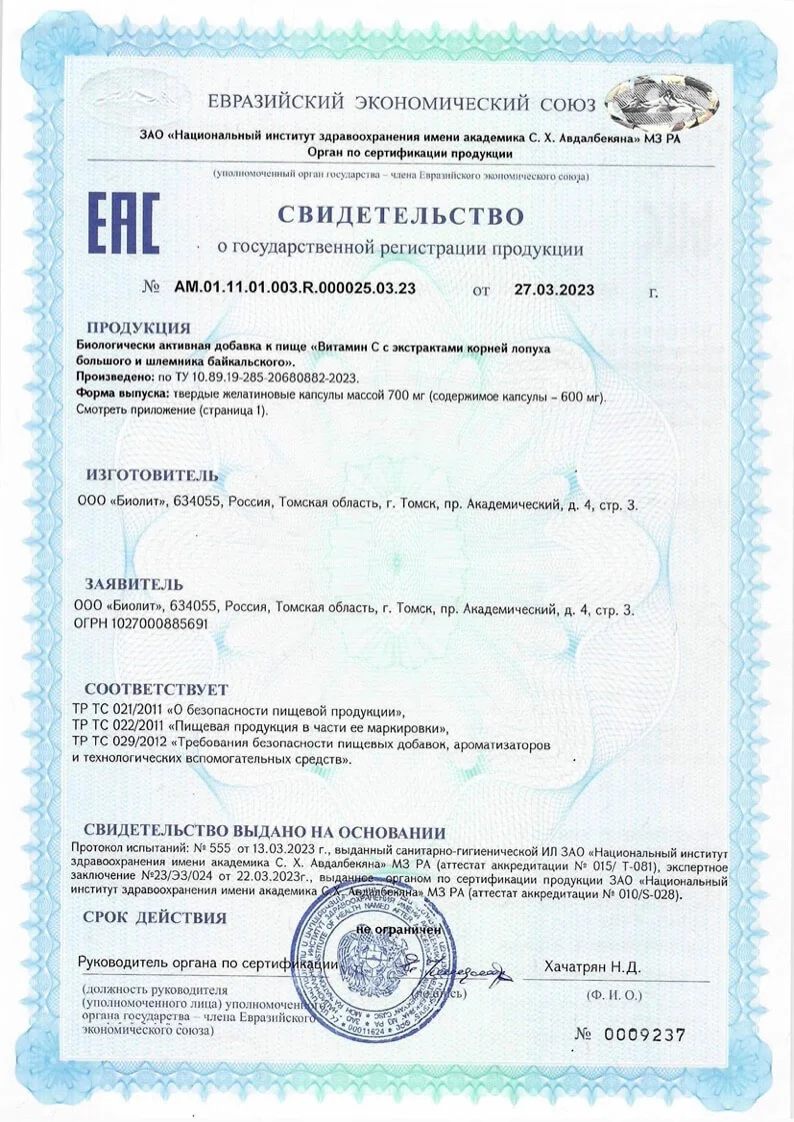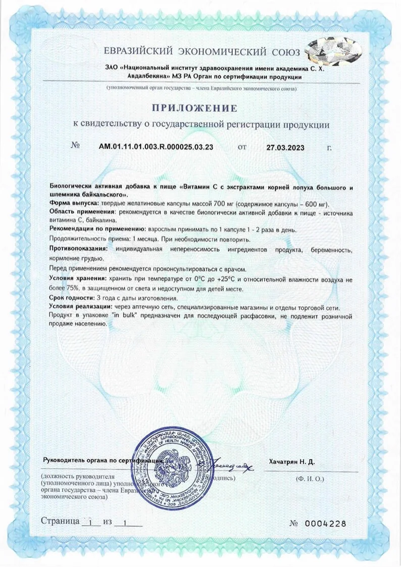Состав: Аскорбиновая кислота (витамин С), экстракт корней лопуха большого (Arctium lappa L.) концентрированный сухой, стеарат кальция, экстракт корней шлемника байкальского (Scutellaria baicalensis) концентрированный сухой.