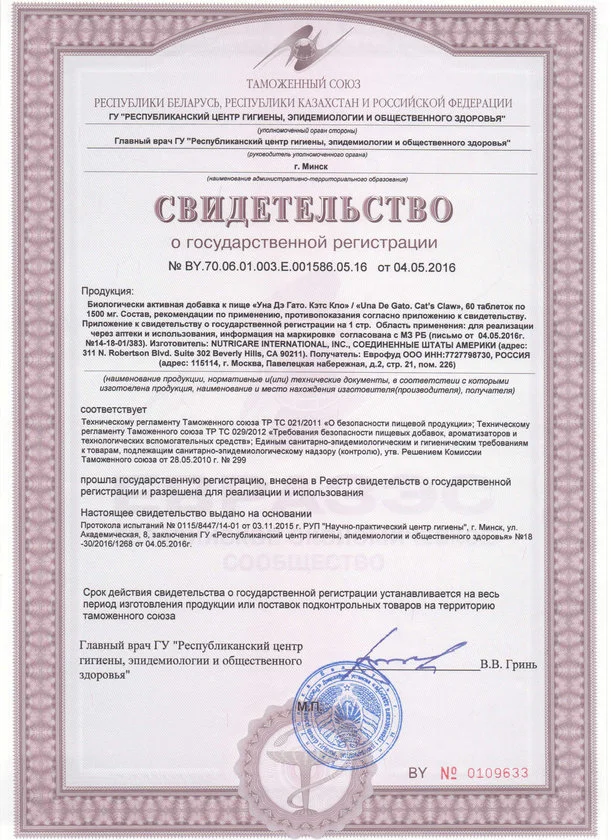Состав: В 1 таблетке: порошок корня кошачьего когтя (Uncaria tomentosa) – 500 мг, порошок корня солодки гладкой (Glycyrrhiza Glabra L.) – 480 мг, листья малины обыкновенной (Rubus idaeus) – 390 мг. Вспомогательные компоненты: регулятор кислотности (фосфат дикальция E341), загуститель (целлюлоза микрокристаллическая E460), эмульгатор (стеариновая кислота (растительного происхождения)), стабилизатор (кроскармеллоза E468), наполнитель (стерта магния E470 (растительного происхождения)), фармацевтическая глазурь (шеллака раствор в этаноле). Энергетическая и пищевая ценность: 0,46 ккал / 1,93 кДж; белки – 0,00 г; жиры – 0,05 г; углеводы – 0,14 г.