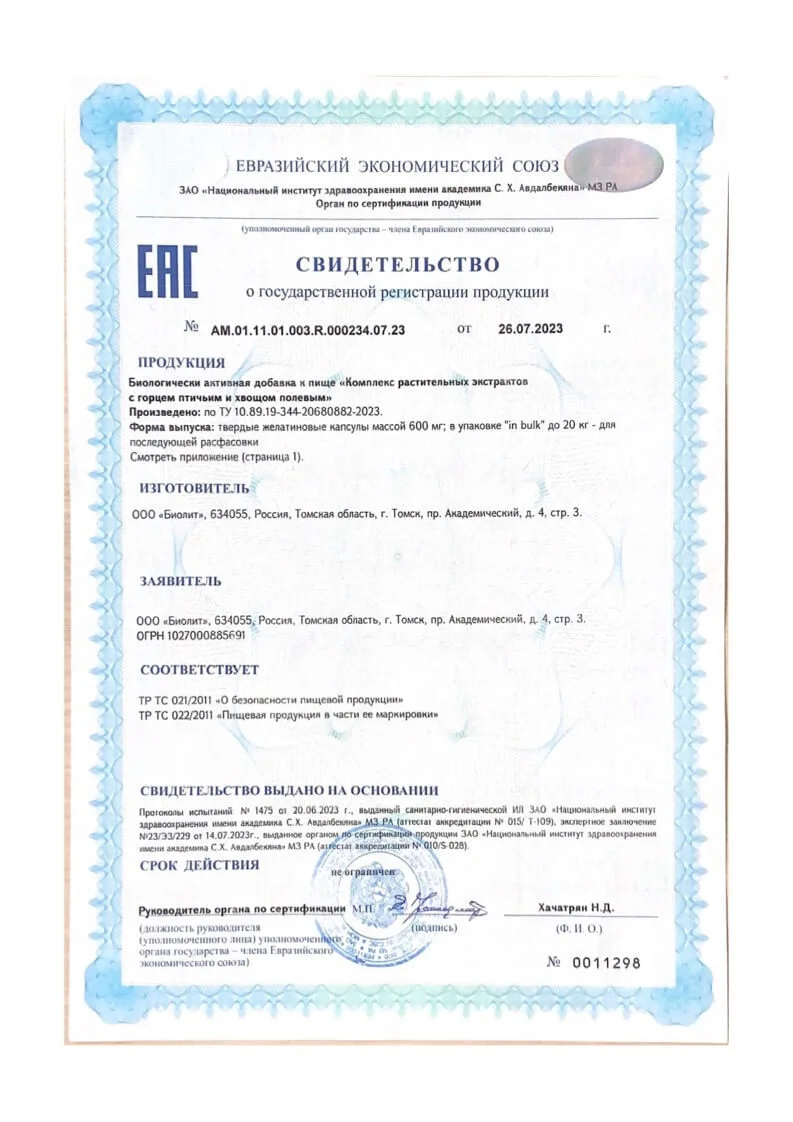 Состав: Экстракты концентрированные сухие травы горца птичьего, листьев березы обыкновенной, травы володушки козелецелистной, травы хвоща полевого, побегов курильского чая, концентрированные соки сухие плодов аронии черноплодной, плодов рябины обыкновенной, экстракты концентрированные сухие побегов черники обыкновенной, корней лопуха большого.