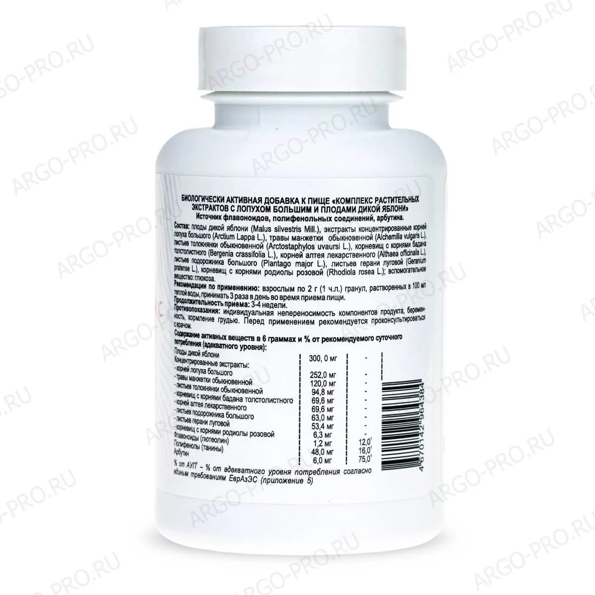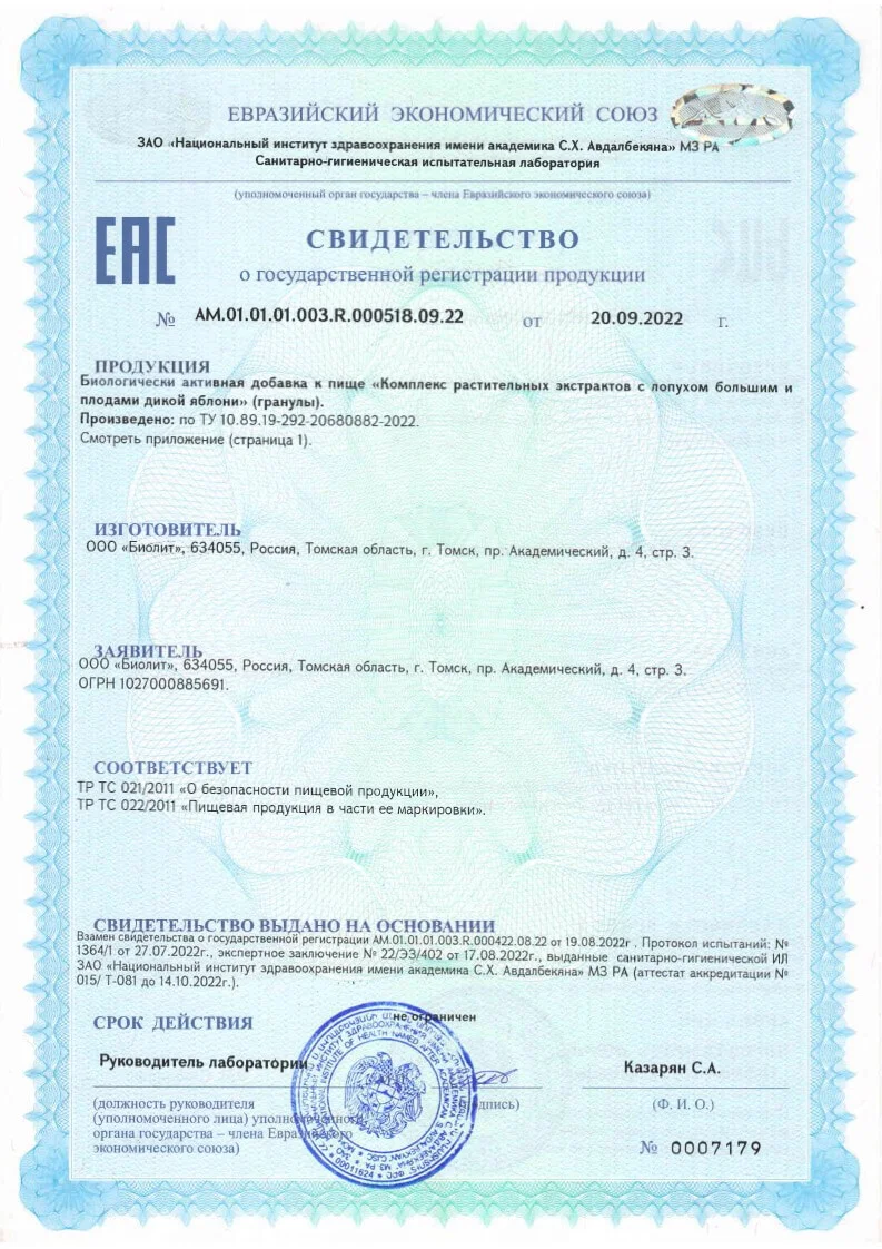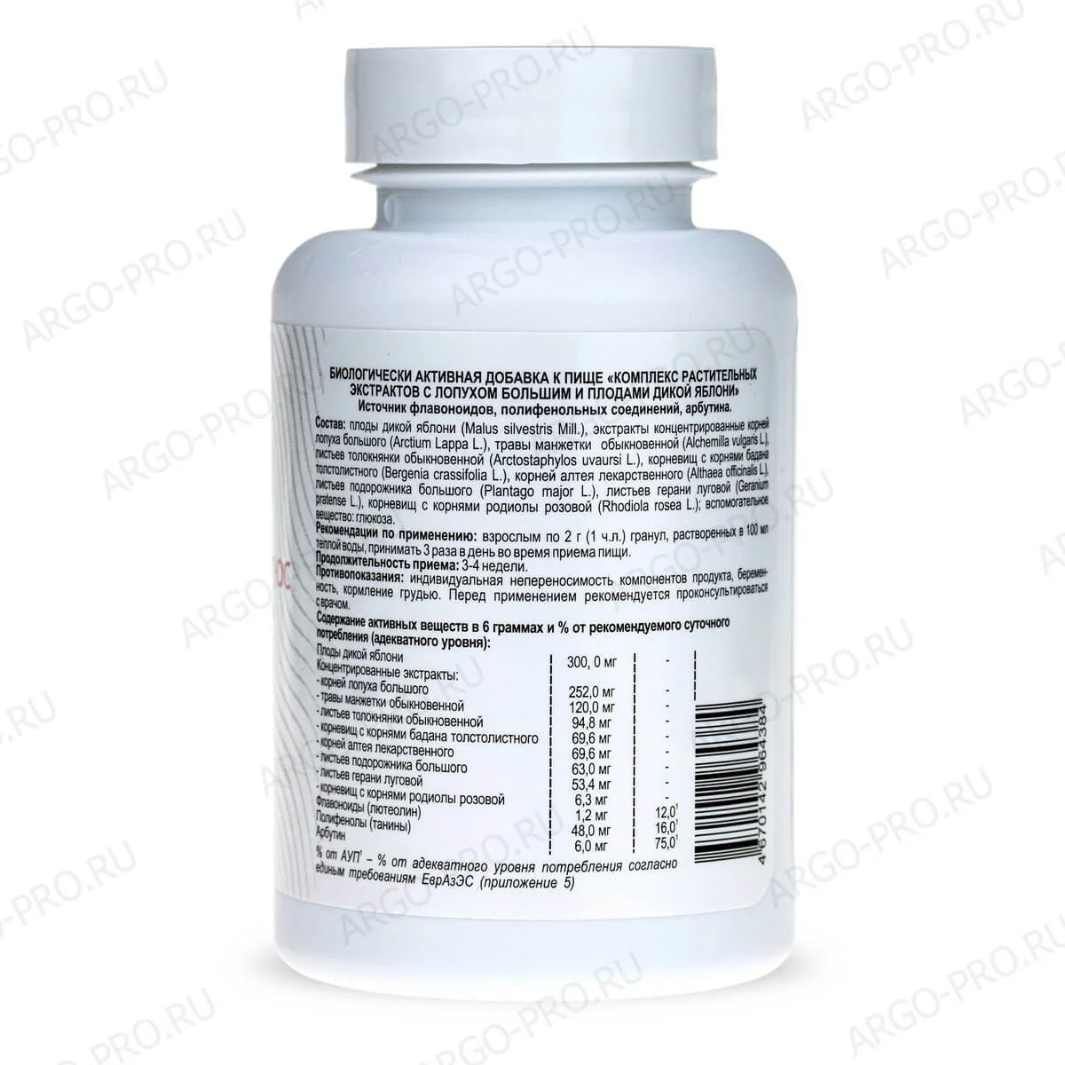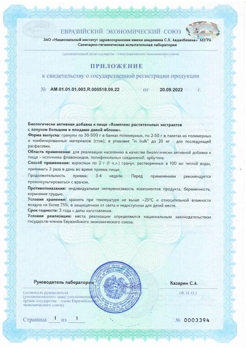 - уменьшения риска развития опухолей на фоне хронических заболеваний. **Состав:**Плоды дикой яблони (Malus silvestris Мill.), концентрированные экстракты: корней лопуха большого (Arctium Lappa L.), травы манжетки обыкновенной (Alchemilla vulgaris L.), листьев толокнянки обыкновенной (Arctostaphylos uva-ursi L.), корневищ с корнями бадана толстолистного (Bergenia crassifolia L.), корней алтея лекарственного (Althaea officinalis L.), листьев подорожника большого (Plantago major L.), листьев герани луговой (Geranium pratense L.), корневищ с корнями родиолы розовой (Rhodiola rosea L.), вспомогательное вещество: глюкоза.