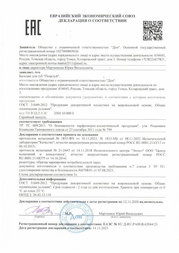 Бальзам предназначен для повседневного ухода за губами, защиты их от обветривания и негативного воздействия окружающей среды.