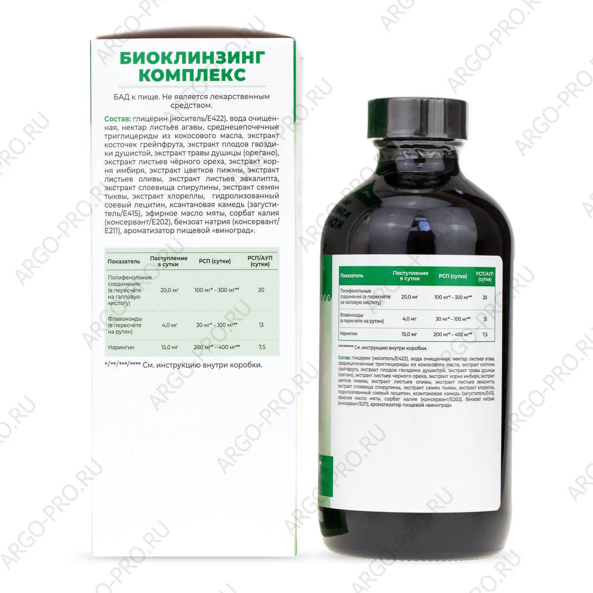Состав: Глицерин (носитель/Е422), вода очищенная, нектар листьев агавы, среднецепочечные триглицериды из кокосового масла, экстракт косточек грейпфрута, экстракт плодов гвоздики душистой, экстракт травы душицы (орегано), экстракт листьев чёрного ореха, экстракт корня имбиря, экстракт цветков пижмы, экстракт листьев оливы, экстракт листьев эвкалипта, экстракт слоевища спирулины, экстракт семян тыквы, экстракт хлореллы, гидролизованный соевый лецитин, ксантановая камедь (загуститель/Е415), эфирное масло мяты, сорбат калия (консервант/Е202), бензоат натрия (консервант/Е211), ароматизатор пищевой «виноград».