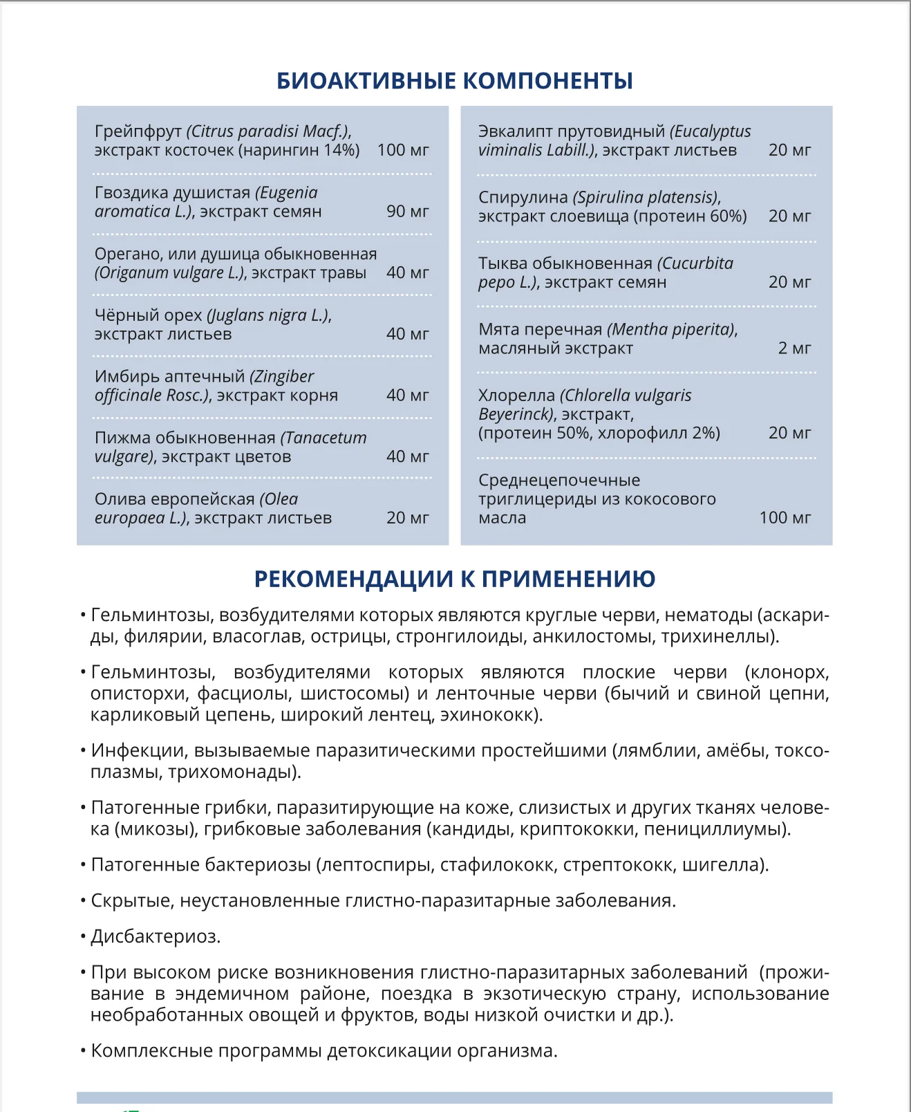 Противопаразитарная защита организма. Способствует избавлению организма от паразитарных инфекций, вызывающих болевые ощущения и развитие тяжелых кишечных заболеваний (лямблиоз, хламидиоз, грибковые болезни, глисты и т. д.).