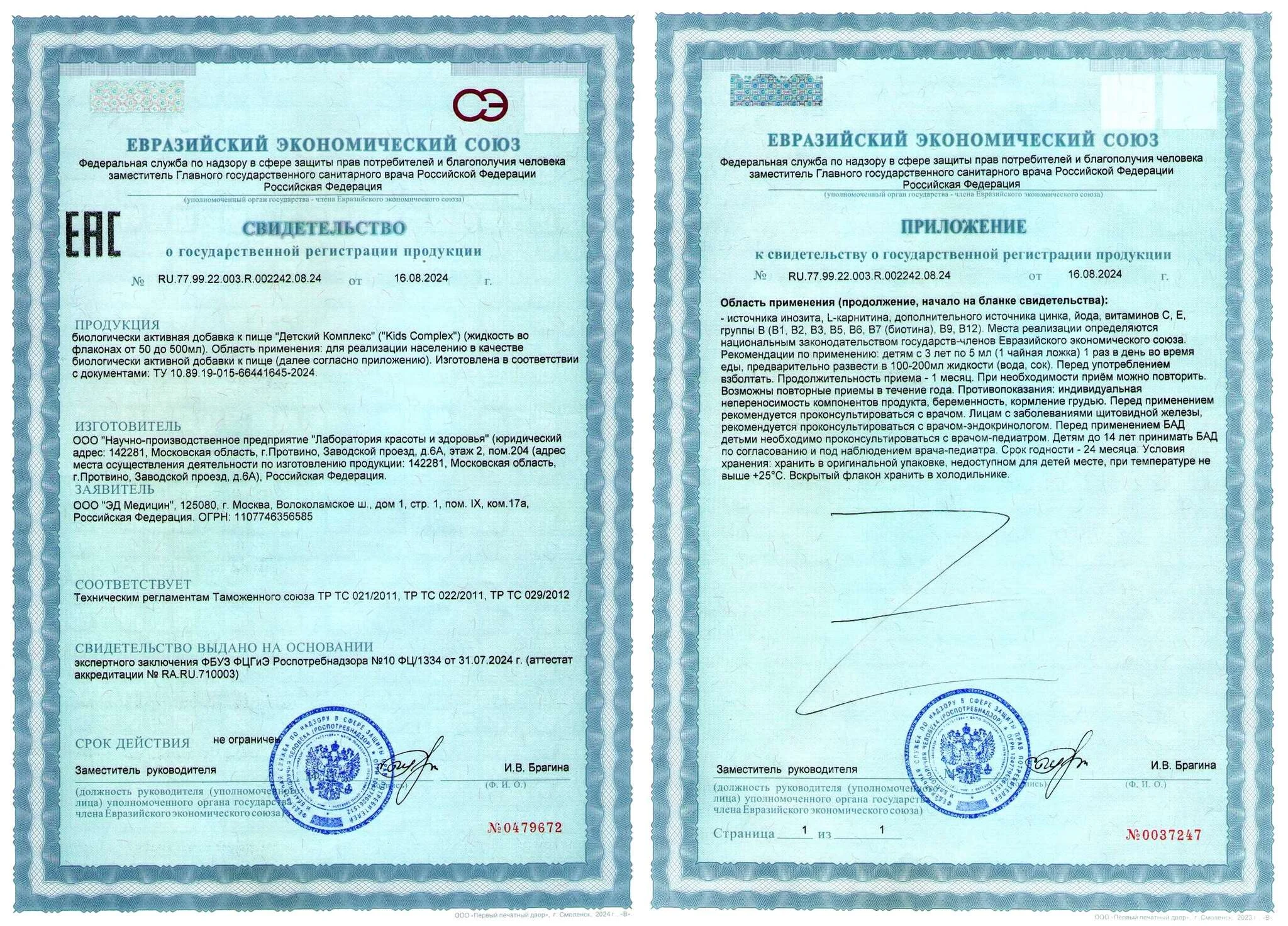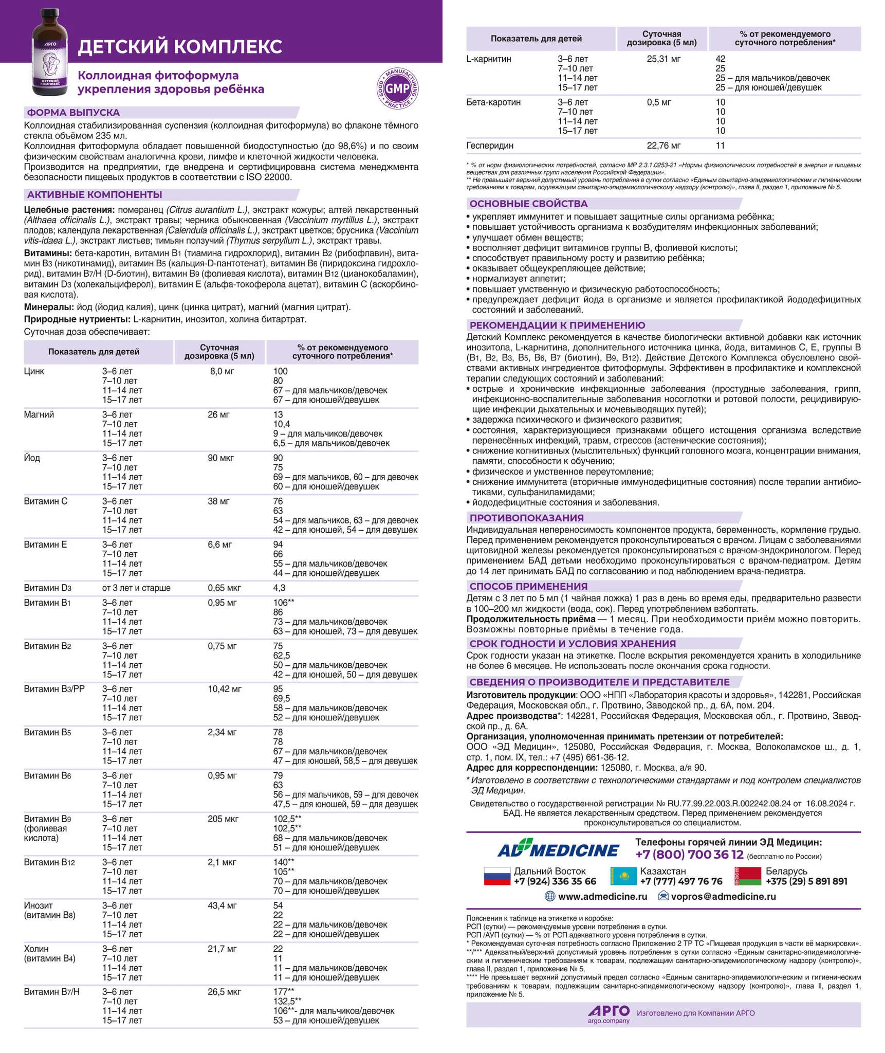 Детский Комплекс рекомендуется в качестве биологически активной добавки к пище как источник инозитола, L-карнитина, дополнительного источника цинка, йода, витаминов С, Е, группы В (В1, В2, В3, В5, В6, В7 (биотин), В9, В12.