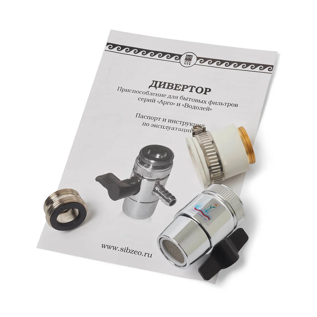 Дивертор металлический предназначен для подключения бытовых фильтров серии "Арго" и "Водолей" к кухонному смесителю. Применение дивертора позволяет фильтру быть постоянно подключенным к смесителю и не требует его отсоединения каждый раз после фильтрации.