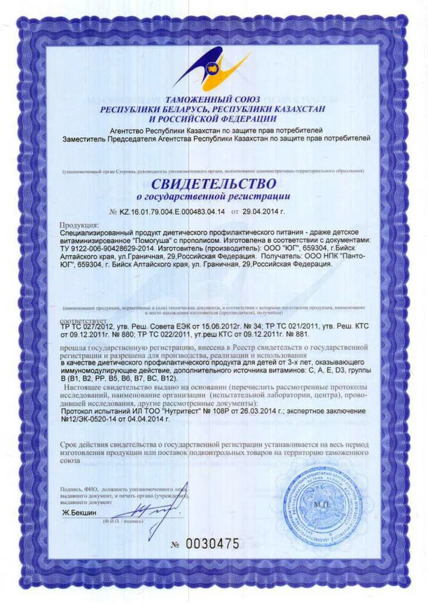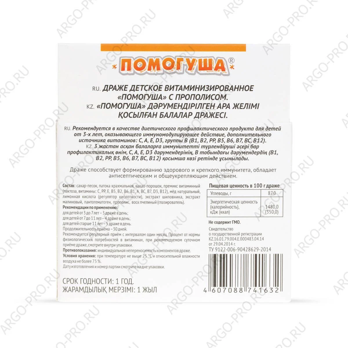 Драже детское витаминизированное «Помогуша» с прополисом рекомендуется в качестве диетического профилактического продукта для детей от 3-х лет, оказывающего иммуномодулирующее действие, дополнительного источника витаминов: С,А, Е, D3, группы В (В1, В2, РР, В5, В6, В7, ВС, В12).