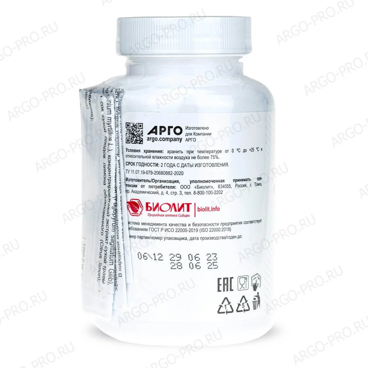 Состав: Концентрированный сок сухой корнеплодов моркови посевной (Daucus sativus), порошок корнеплодов моркови посевной (Daucus sativus), концентрированный сок сухой плодов облепихи крушиновидной (Hyppophae rhamnoides L.), концентрированные экстракты сухие плодов шиповника коричного (Rosa cinnamomea L.), травы гречихи посевной (Fagopyrum sagittatum Gilib), концентрированный сок сухой плодов черники обыкновенной (Vaccinium myrtillus L.), концентрированный экстракт сухой травы очанки лекарственной (Euphrasia officinalis), концентрированный сок сухой плодов лимона обыкновенного (Citrus limon); вспомогательное вещество: глюкоза.