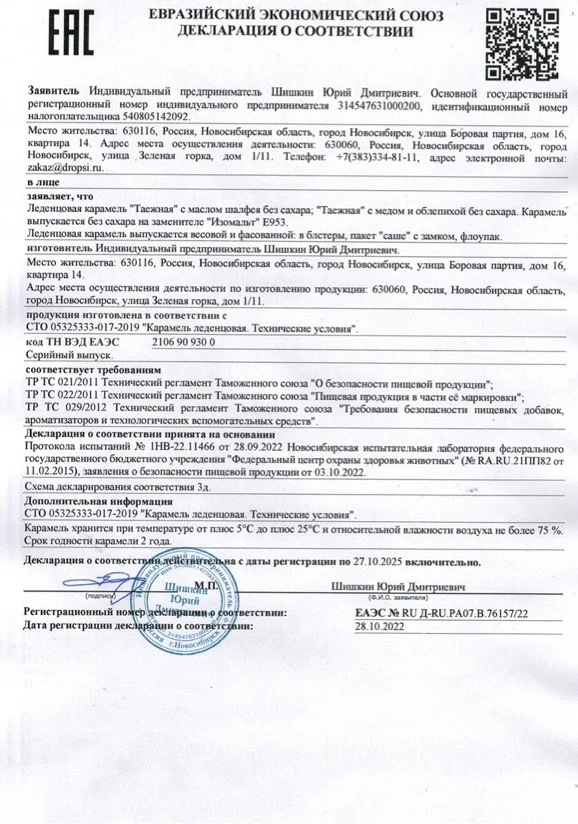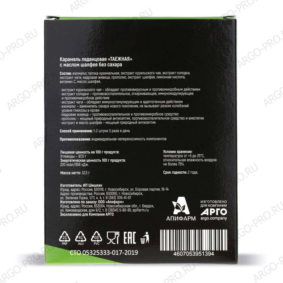 Состав: Изомальт, патока крахмальная, экстракт курильского чая, экстракт солодки, экстракт чаги, кедровая живица, прополис, экстракт шалфея, лимонная кислота, витамин С, масло шалфея. Энергетическая ценность на 100 г продукта – 220 ккал.