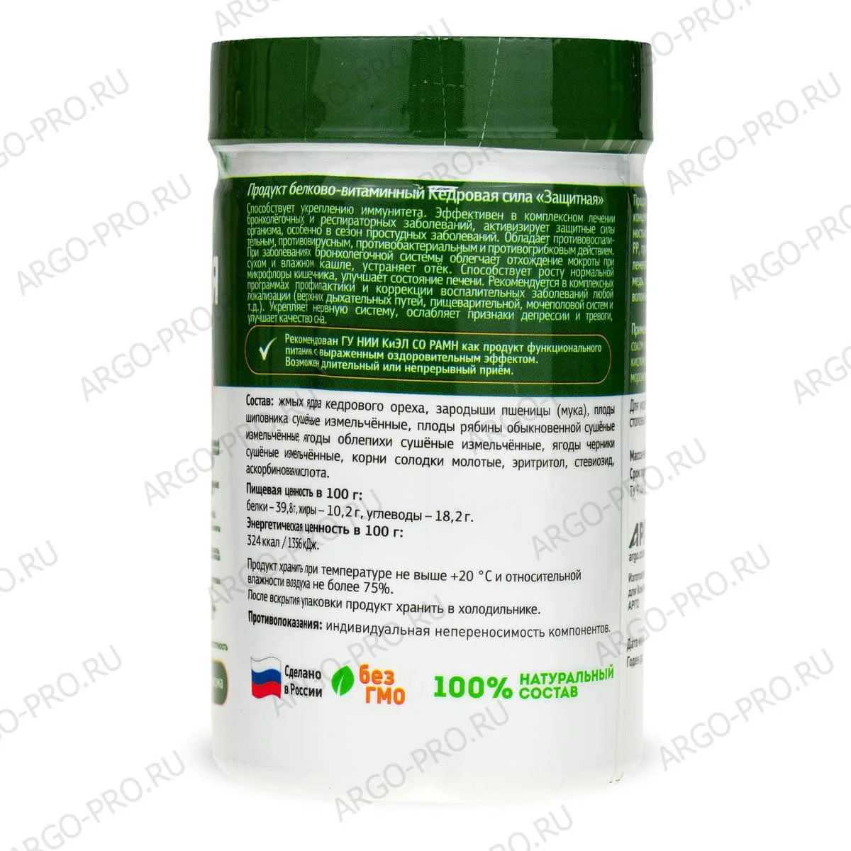 Состав: Жмых ядра кедрового ореха; зародыши пшеницы (мука); плоды шиповника сушёные измельчённые; плоды рябины обыкновенной сушёные измельчённые; фруктоза; ягоды облепихи сушёные измельчённые; ягоды черники сушёные измельчённые; корни солодки молотые; аскорбиновая кислота. Пищевая ценность: 100 г продукта: белки – 37,54 г; жиры – 22,29 г; углеводы – 28,67 г. Энергетическая ценность: 100 г продукта: 243,20 ккал / 1018,23 кДж.