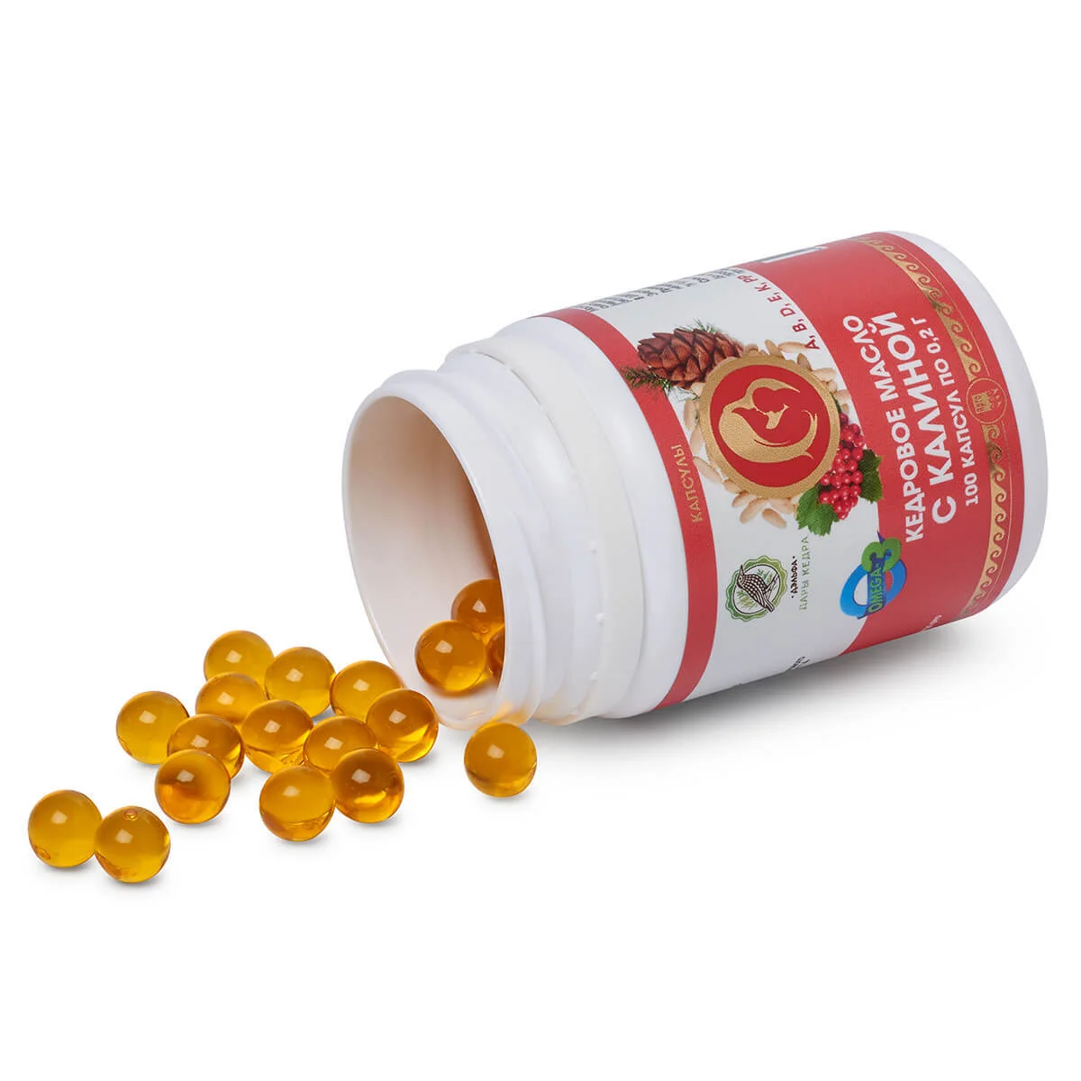 Состав: Масло растительное нерафинированное - смесь «Кедровое с калиной» (нерафинированные кедровое масло, масло калины (экстракт)); желатин.