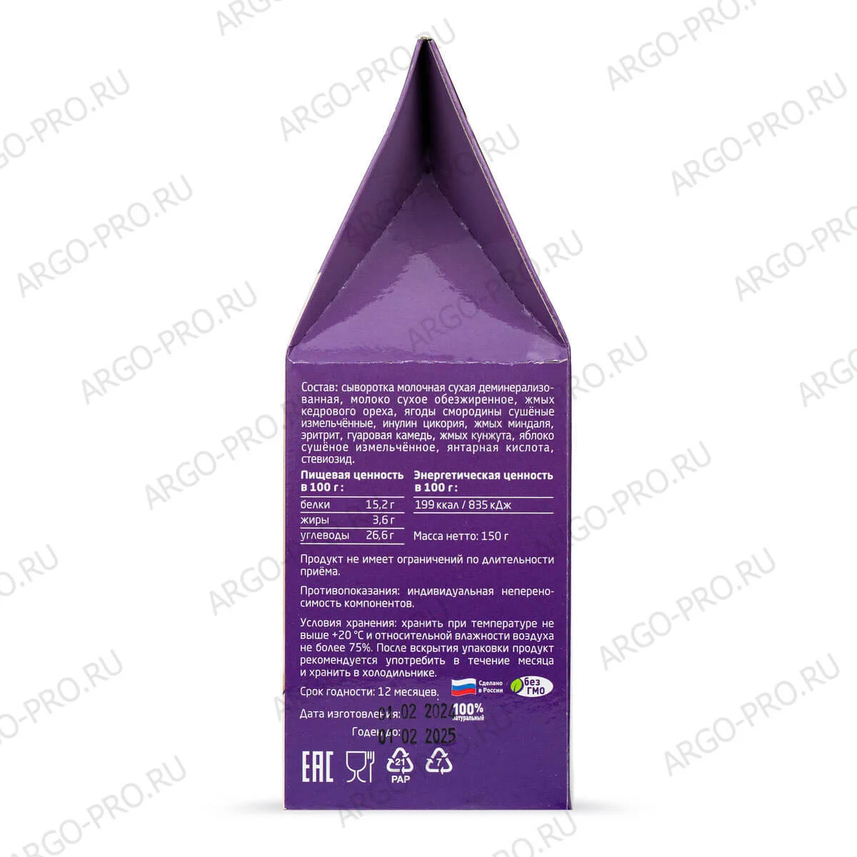 Состав: Сыворотка молочная сухая деминерализованная, эритрит, молоко сухое обезжиренное, ягоды смородины сушеные измельченные, инулин цикория, жмых миндаля, гуаровая камедь, жмых кунжута, яблоко сушеное измельченное, жмых кедрового ореха, ароматизатор «Смородина» натуральный, янтарная кислота, стевиозид, каррагинан. Пищевая ценность 100 г продукта: белки -15,21 г; жиры – 3,57г; углеводы -27,60 г. Энергетическая ценность 100 г продукта: 203,37 ккал/851,47 кДж.