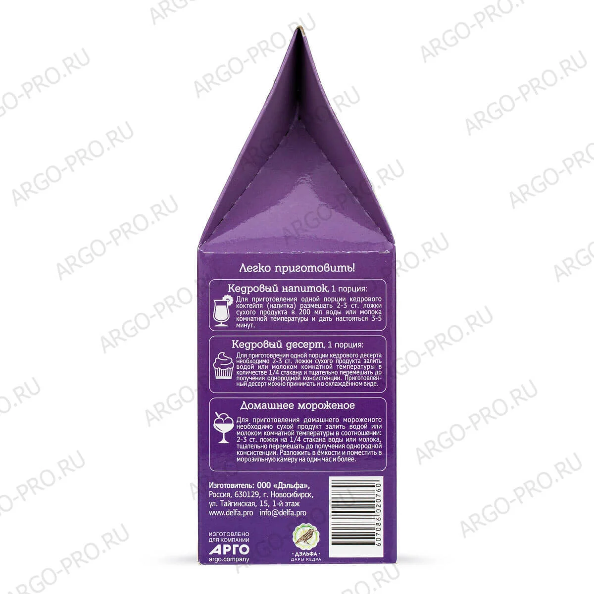 - Для приготовления одной порции кедрового десерта необходимо 25 г сухого продукта (1ст. ложка) залить водой или молоком комнатной температуры в количестве ¼ стакана, тщательно перемешать до получения однородной консистенции. Можно есть охлажденным.