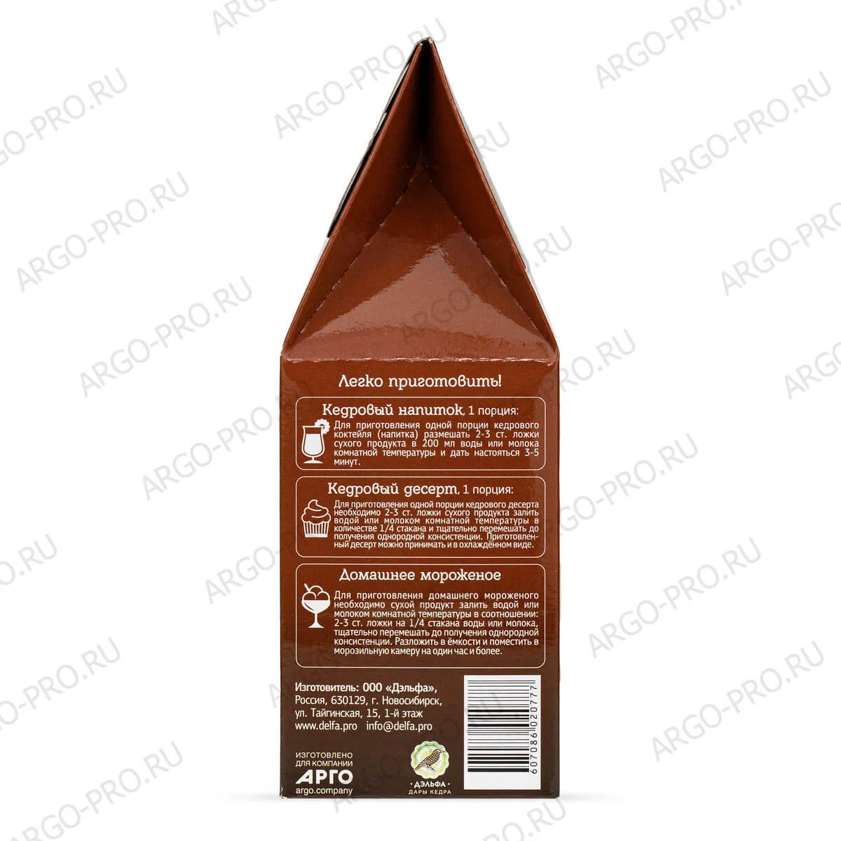 - Для приготовления одной порции кедрового десерта необходимо 25 г сухого продукта (3ст. ложка) залить водой или молоком комнатной температуры в количестве 1/4 стакана, тщательно перемешать до получения однородной консистенции. Приготовленный десерт можно принимать и в охлаждённом виде.