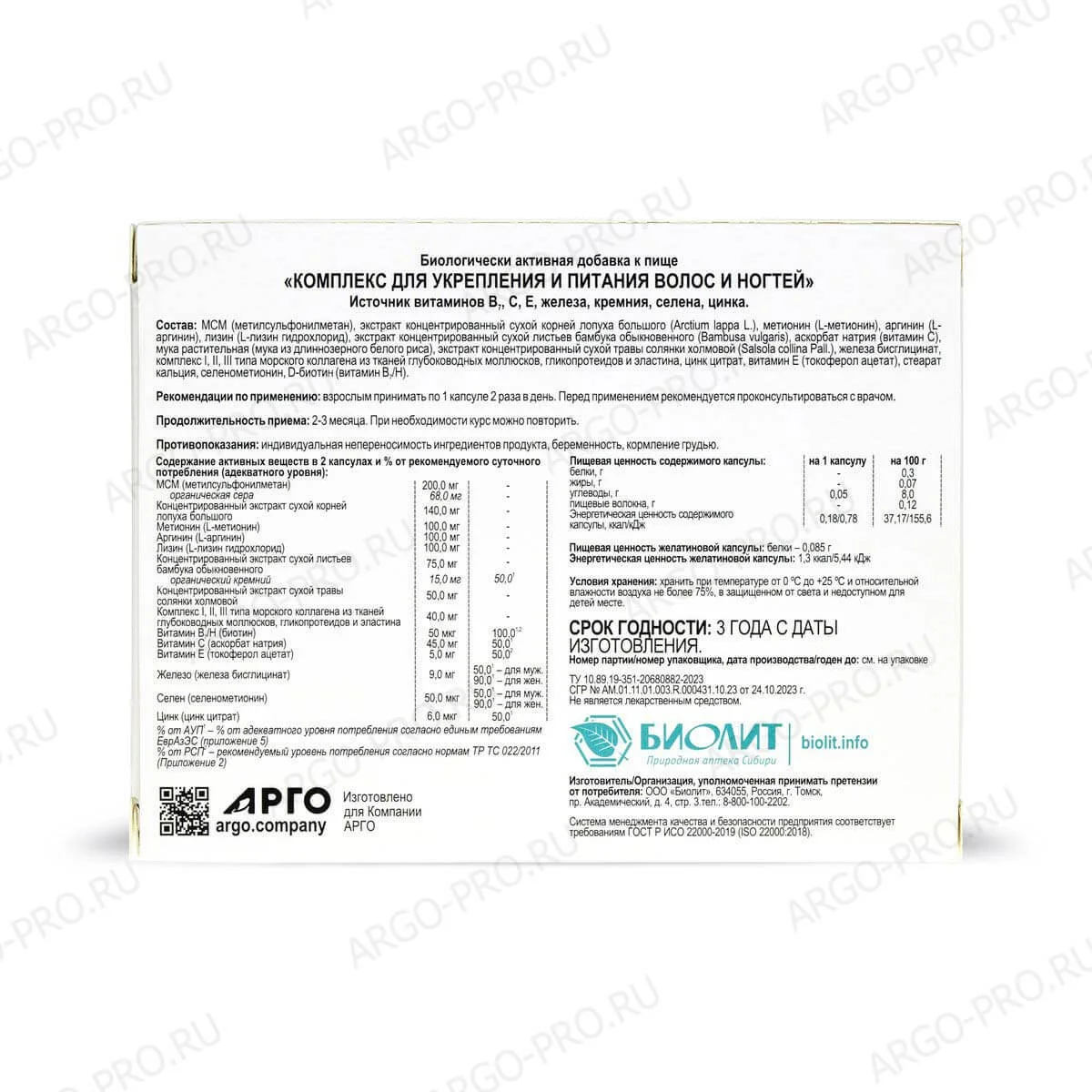 Комплекс для укрепления и питания волос и ногтей, Биолит (Арго), 60 капс