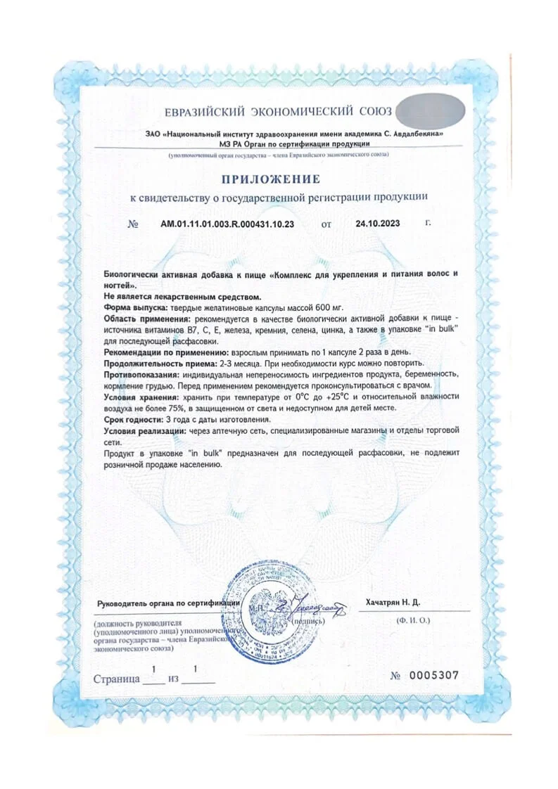 Состав: МСМ (метилсульфонилметан), экстракт концентрированный сухой корней лопуха большого, метионин (L-метионин), аргинин (L-аргинин), лизин (L-лизин гидрохлорид), экстракт концентрированный сухой листьев бамбука обыкновенного, аскорбат натрия, мука растительная (из длиннозерного белого риса), экстракт концентрированный сухой травы солянки холмовой, железа бисглицинат, комплекс I, II, III типа морского коллагена из тканей глубоководных моллюсков, гликопротеидов и эластина, цинк цитрат, витамин Е, стеарат кальция, селенометионин, D-биотин (витамин В7/Н).