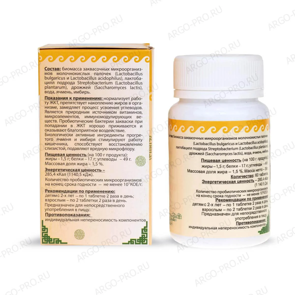Состав: Биомасса заквасочных микроорганизмов молочнокислых палочек (Lactobacillus bulgaricus и Lactobacillus acidophilus), лактобацилл подрода Streptobacterium (Lactobacillus plantarum), дрожжей (Saccharomyces lactis), вода, ячмень, имбирь. Основная пища народов Тибета – цзамба: поджаренная ячменная мука, смешанная с маслом, иногда с чаем, а также кислое молоко и ячменное пиво. У бурят каша из обжаренной ячменной муки с добавлением сливочного масла и чая называется замбаа. Некоторые из родов считают ее вторым хлебом. На протяжении многих столетий это блюдо оставалось незаменимым в меню сельчан. Если съесть такую кашу на завтрак – весь день будешь сытым. Ячмень толкут, поджаривают и добавляют в горячий чай, добавляя по вкусу масло и сахар. В старые времена буряты предпочитали варить аарсу из курунги с ячменными молотыми зернами или гречихой-горлецом. Аарсой поили ослабевший за зиму скот и пили сами. Действие компонентов Ячмень богат калием, магнием, белком, клетчаткой, и другими незаменимыми для человеческого организма витаминов и микроэлементов. Помогает в функциональной работе сердца, нормализует давление. Волокна ячменя нормализуют работу желудочно-кишечного тракта и кишечника, выводит шлаки и токсины. Влияет на работу эндокринной системы, надпочечников, улучшает зрения, за счет содержания витамина А. Положительно воздействует на нервную систему, кожу, волосы, за счет высокого содержания витаминов группы В, улучшает кислородный обмен в клетках и имеет антиоксидантные свойства. Ячмень нормализует уровень сахара в крови, замедляет процессы усвоения углеводов. Имбирь обладает ярко выраженным спазмолитическим, противовоспалительным и тонизирующими свойством. Кроме того, имбирь – мощный природный антиоксидант, способный снимать сильные желудочные боли. При лечении ожирения часто рекомендуют имбирь включать в блюда, например, добавлять в кисломолочный продукт немного этой пряности и выпивать за полчаса до еды.