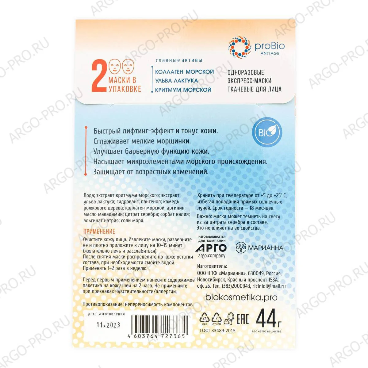 Маска для лица тканевая Лифтинг-эффект, Марианна (Арго), 2 шт