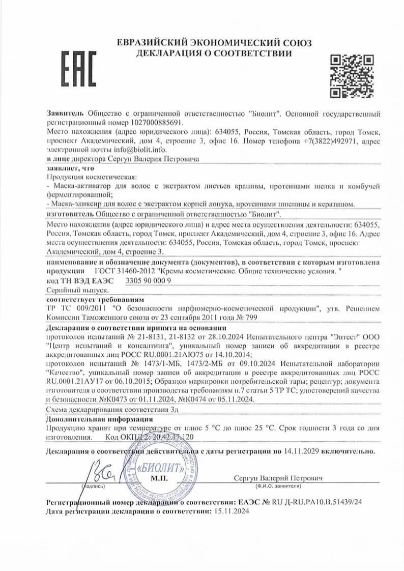 Маска для волос с экстрактом корней лопуха, Биолит (Арго), 250 мл
