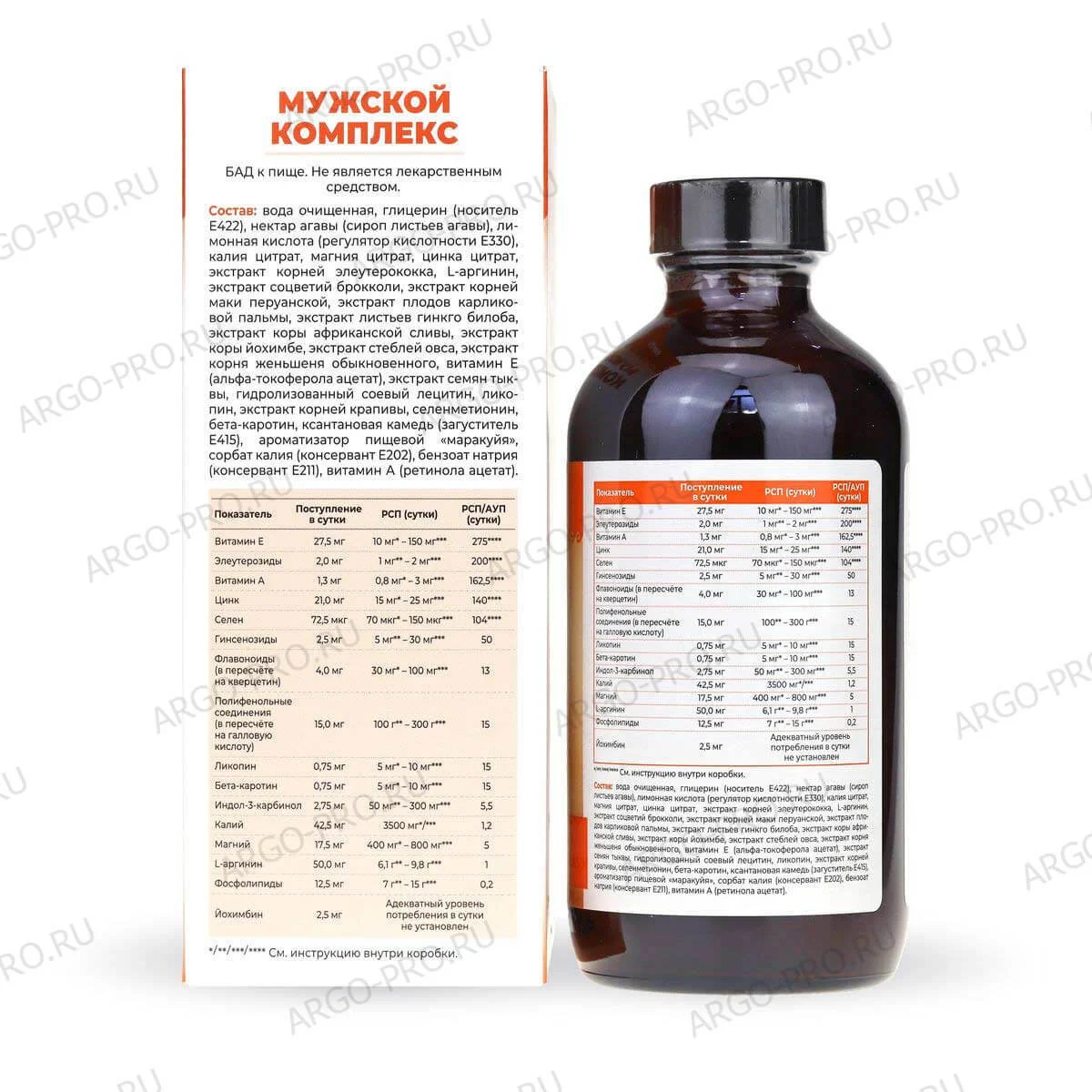 Состав: вода очищенная, глицерин (носитель Е422), нектар агавы (сироп листьев агавы), лимонная кислота (регулятор кислотности Е330), калия цитрат, магния цитрат, цинка цитрат, экстракт корней элеутерококка, L-аргинин, экстракт соцветий брокколи, экстракт корней маки перуанской, экстракт плодов карликовой пальмы, экстракт листьев гинкго билоба, экстракт коры африканской сливы, экстракт коры йохимбе, экстракт стеблей овса, экстракт корня женьшеня обыкновенного, витамин E (альфа-токоферола ацетат), экстракт семян тыквы, гидролизованный соевый лецитин, ликопин, экстракт корней крапивы, селенметионин, бета-каротин, ксантановая камедь (загуститель Е415), ароматизатор пищевой «маракуйя», сорбат калия (консервант E202), бензоат натрия (консервант E211), витамин А (ретинола ацетат).