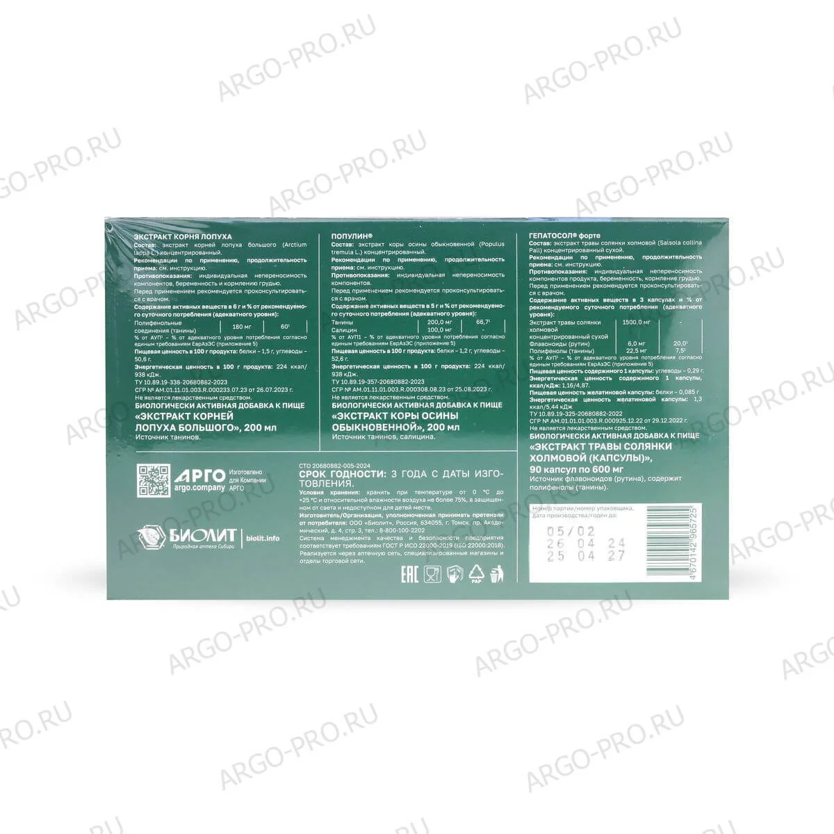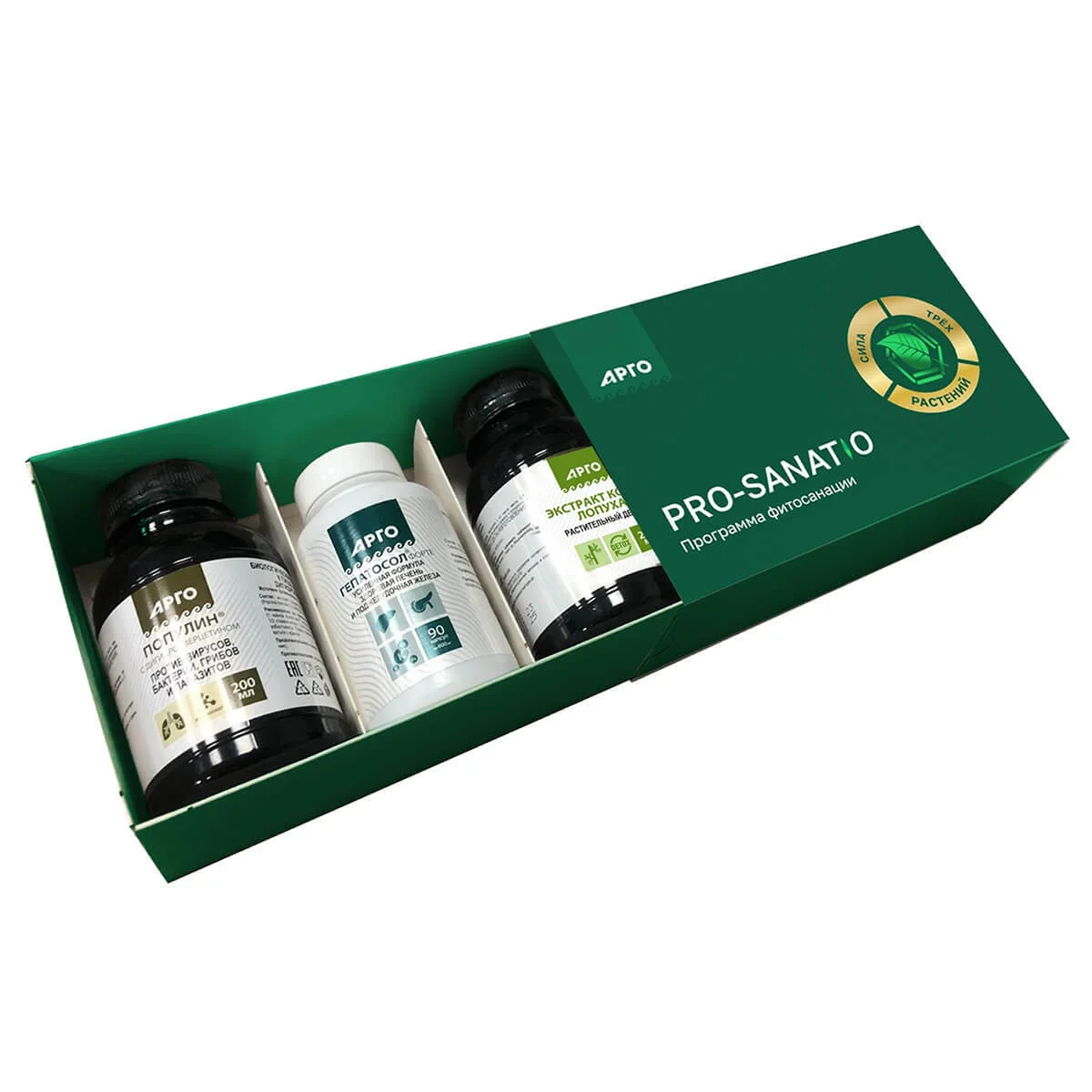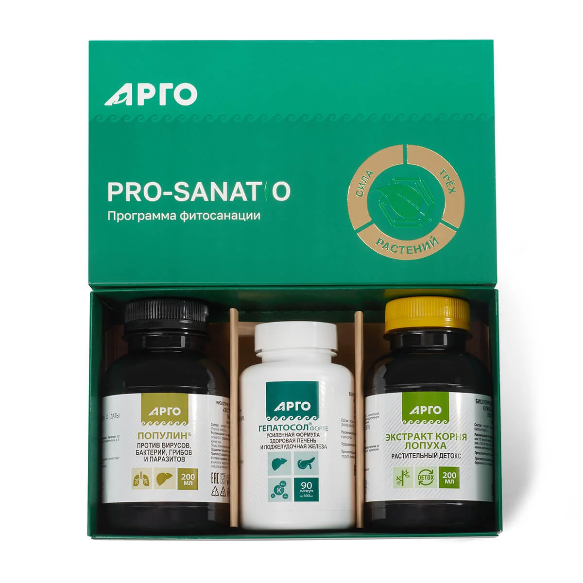 Состав: 1. БАД «Популин» (экстракт коры осины обыкновенной), 200 мл. Источник танинов, салицина. 2. БАД «Гепатосол-форте» (экстракт травы солянки холмовой), 90 капсул. Источник флавоноидов (рутина), содержит полифенолы (танины). 3. БАД «Экстракт корня лопуха» (экстракт корней лопуха большого), 200 мл. Источник танинов.