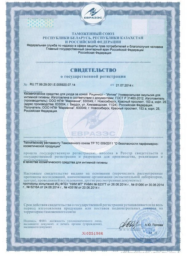 Внимание! Кожная проба. Обычно использование «Рициниола Интим» не вызывает аллергии. Однако возможны случаи индивидуальной чувствительности к компонентам гигиенической эмульсии. Поэтому перед ее применением необходимо сделать кожную пробу. Нанесите 1–2 капли эмульсии на внутреннюю локтевую поверхность и оставьте на 2 часа. Если появится покраснение, зуд или припухлость, «Рициниолом Интим» Вам пользоваться нельзя.