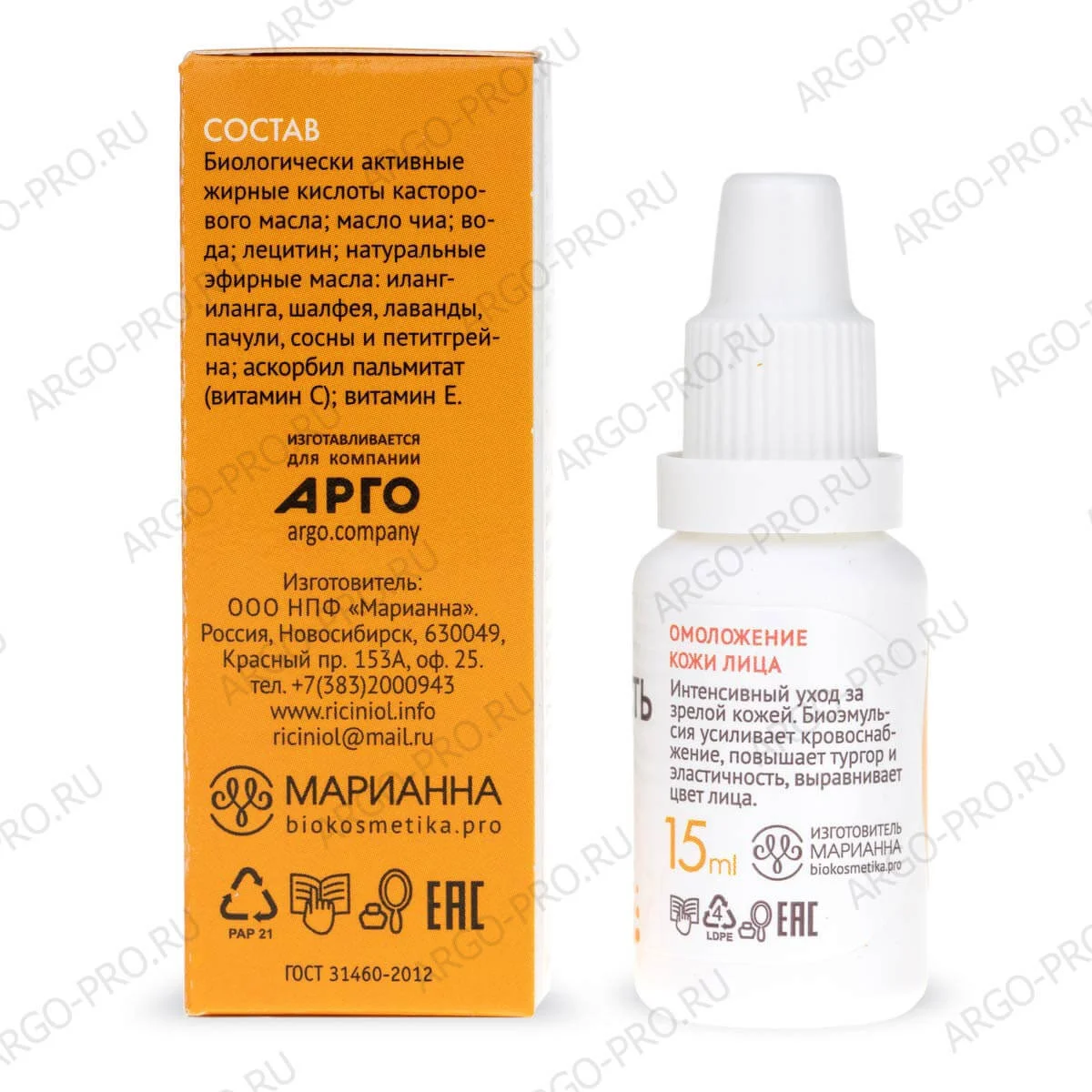 Форма выпуска: флакон 12 мл.Срок годности – 2 года. Дата выпуска на нижней стороне упаковки.Не является лекарством. Косметическая эмульсия с подтягивающим эффектом. Изготавливается по заказу Компании АРГО.