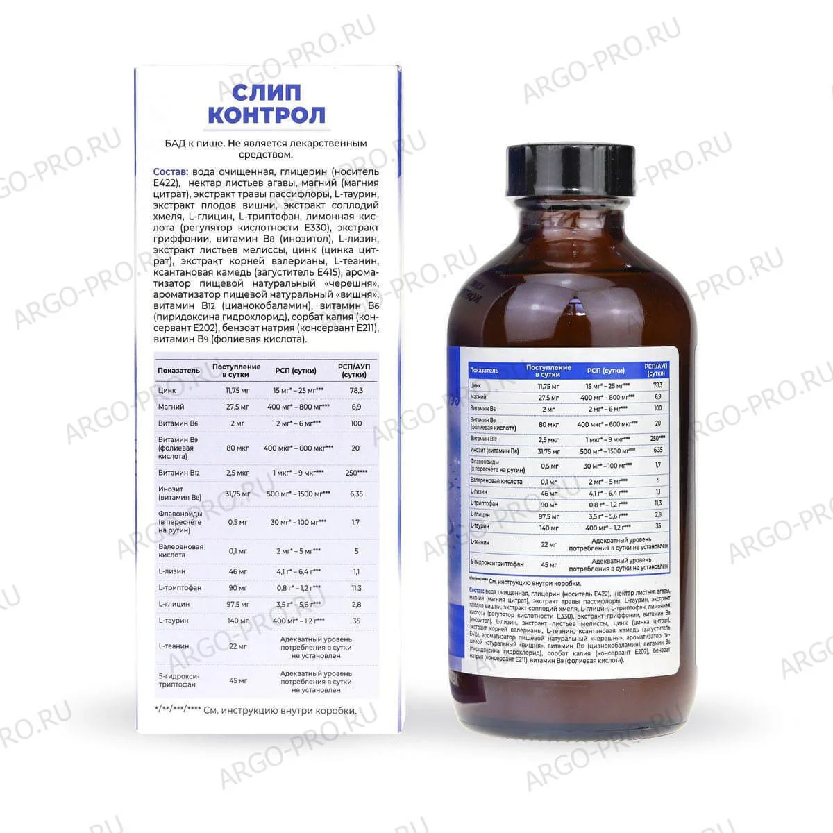 Состав: Вода очищенная, глицерин (носитель Е422), нектар листьев агавы, магний (магния цитрат), экстракт травы пассифлоры, L-таурин, экстракт плодов вишни, экстракт соплодий хмеля, L-глицин, L-триптофан, лимонная кислота (регулятор кислотности Е330), экстракт гриффонии, витамин В8 (инозитол), L-лизин, экстракт листьев мелиссы, цинк (цинка цитрат), экстракт корней валерианы, L-теанин, ксантановая камедь (загуститель Е415), ароматизатор пищевой натуральный «черешня», ароматизатор пищевой натуральный «вишня», витамин В12 (цианокобаламин), витамин В₆ (пиридоксина гидрохлорид), сорбат калия (консервант Е202), бензоат натрия (консервант Е211), витамин В9 (фолиевая кислота).