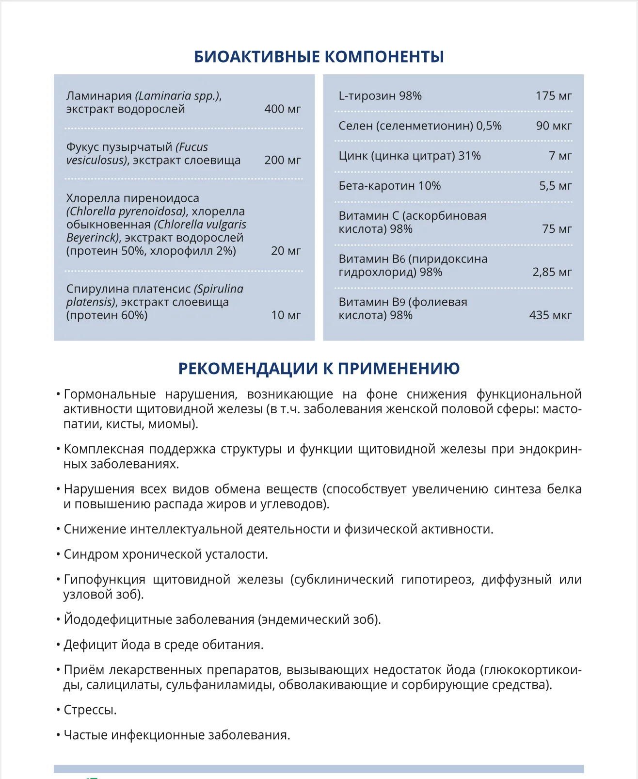 Комплексно поддерживает структуру щитовидной железы, активирует и гармонизирует ее функциональную активность, улучшает регулирующее влияние щитовидной железы на ее организм и все виды обмена веществ: